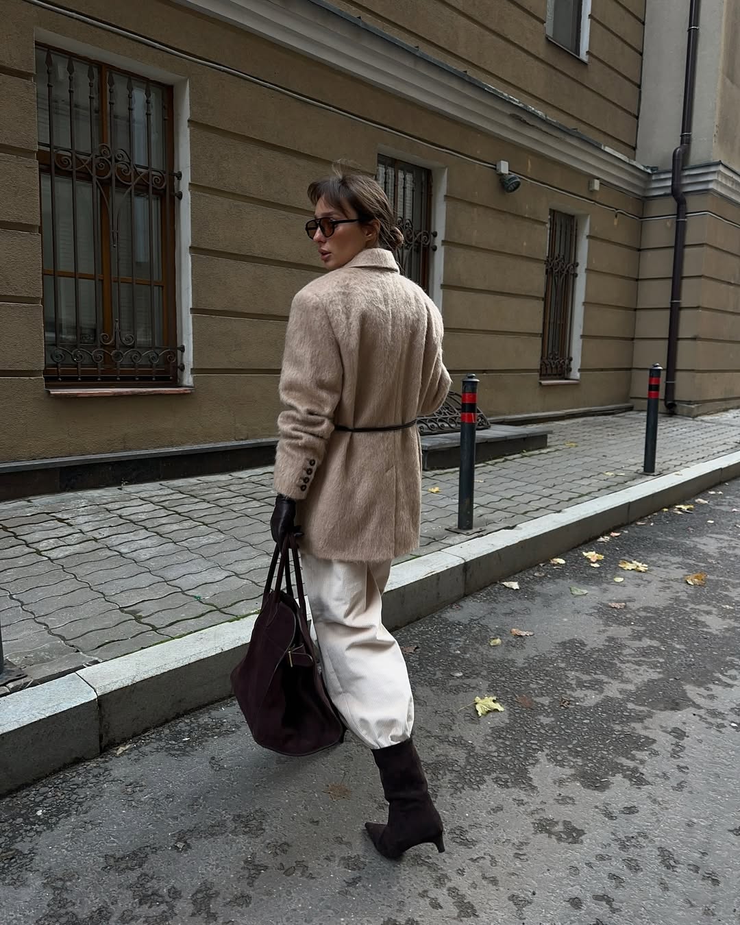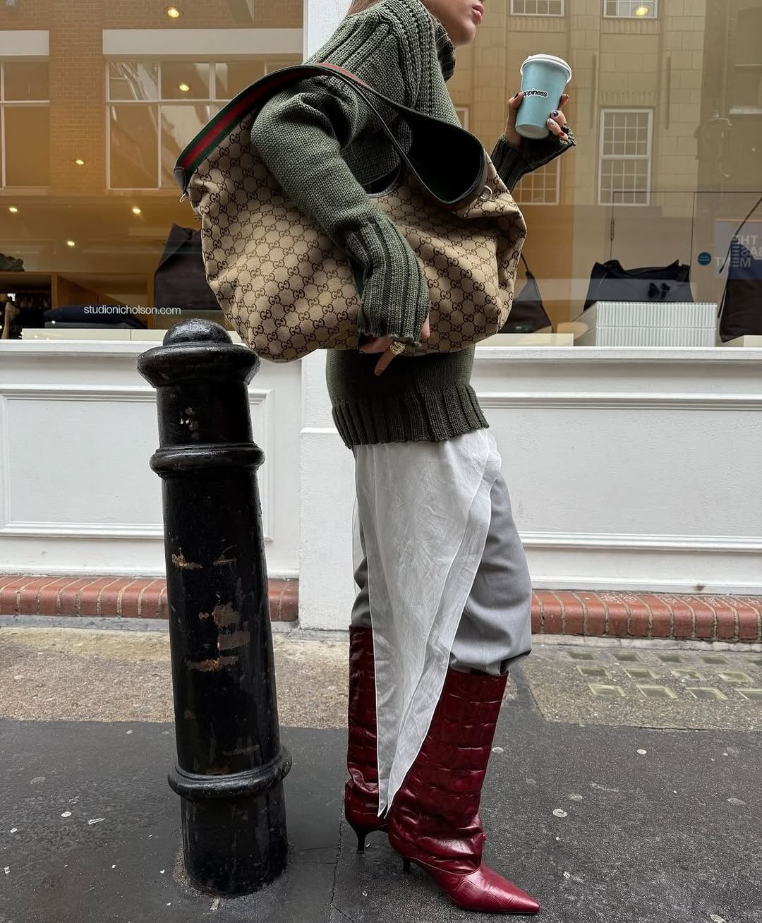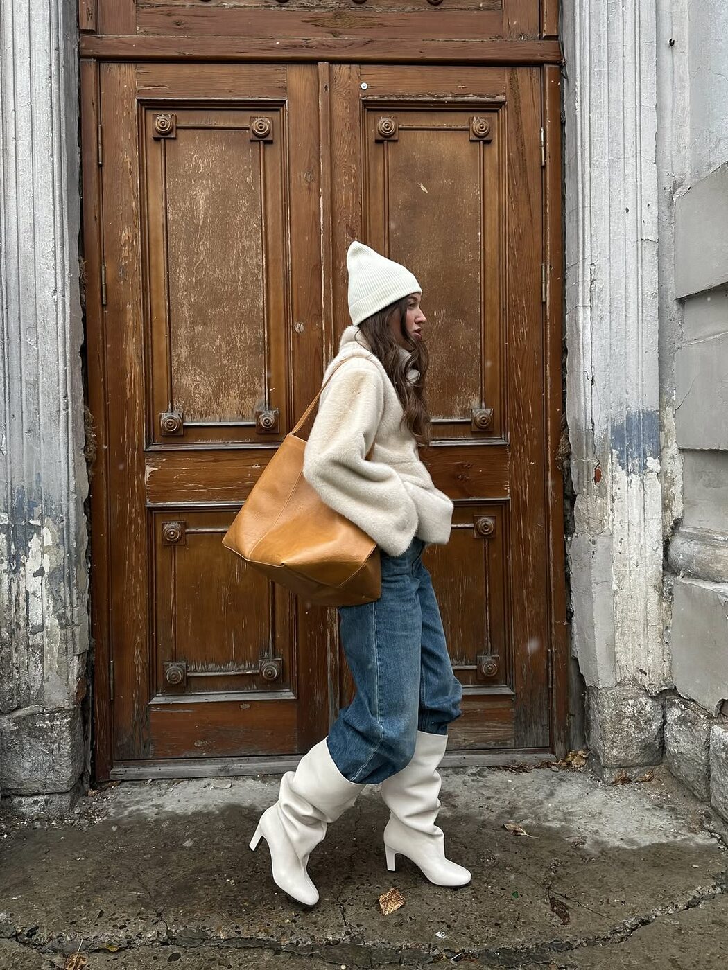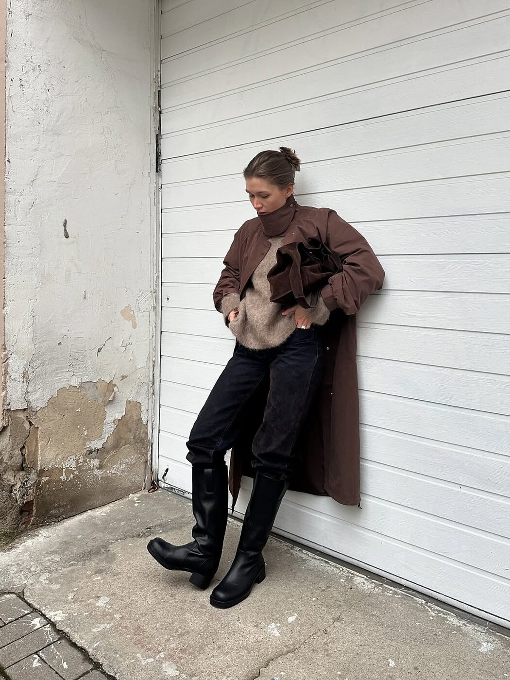 스타일의 핵심은 어떤 부츠를 선택하느냐예요. 발목까지 오는 앵클부츠보다는 무릎 가까이 올라오는 롱부츠나 미들 부츠, 그리고 통이 여유 있는 실루엣의 부츠를 고르는 게 좋아요. 그래야 바지를 넣었을 때 볼륨이 자연스럽게 잡히면서 부담 없이 멋스럽게 스타일링할 수 있거든요.