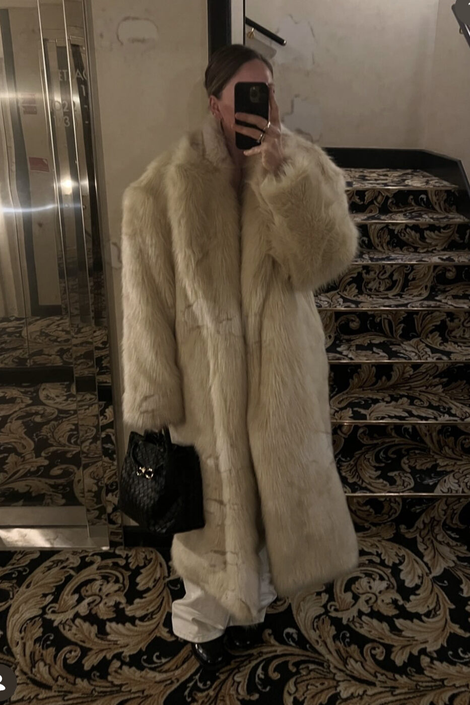 길이가 긴 코트에 펄까지 긴 맥시 스타일의 퍼는 여성스럽고 로맨틱한 무드를 넘어 넘볼수 없는 존재감을 선사합니다. 클래식한 블랙 토트 백으로 완성한 룩은 마피아의 아내, 몹 와이프 스타일링에 제격이죠.