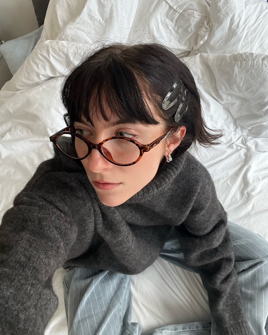 번 스타일로 머리를 묶을 수 없는 단발 헤어라면 액세서리를 활용해 보세요. 똑딱이 핀 하나만 더해도 스타일의 바이브가 단 번에 바뀌니까요. 귀 옆이나 앞머리 라인에 무심하게 꽂은 핀은 얼굴선을 정리해 주면서 니트의 포근한 질감과 대비되며 귀여운 무드를 내주죠. 머리를 고정시키려는 용도로 핏하게 꽂지 말고, 살짝 비대칭이거나 일부러 대충 꽂은 듯한 느낌이 오히려 멋스럽습니다. 터틀넥의 클래식함을 단발과 핀으로 가볍게 비틀어주는 방식이죠. 니트가 단정할수록, 헤어는 조금 느슨해도 괜찮습니다.