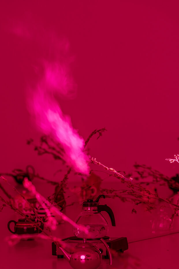 “신작 설치 ‘99개의 꿈’은 오랜 시간 기록해 온 드림 저널에서 피어난 무의식의 파편을 현실 공간으로 옮긴 작업이다. 시간에 따라 변주되는 오렌지 빛과 수증기가 직조하는 시네마틱한 장면 속에서, 작가가 선별한 99개의 찻주전자와 쑥, 소리, 향이 서로 얽히며 보이지 않는 긴장과 흐름을 만들어낸다. 이 무대의 주인공은 퍼포머가 아닌 99개의 주전자로, 때때로 보이는 존재보다 더 위협적이고 매혹적인 부재의 상태를 드러낸다. 고요 속에서 세 개의 끓는 주전자가 내뿜는 증기와 소리, 쑥의 향, 그리고 빛의 리듬은 보이지 않는 노동과 권력의 구조를 환기하며 ‘가시성의 부재’를 하나의 윤리적 제스처로 제안한다. 완전함의 이면에서, 게일은 부재로부터 솟아오르는 사유와 상상의 가능성을 탐색한다. 노을처럼 스며드는 빛 속에서, 작품은 기억과 꿈, 치유와 회복, 그리고 탈주의 가능성을 우리 앞에 드러낸다.”