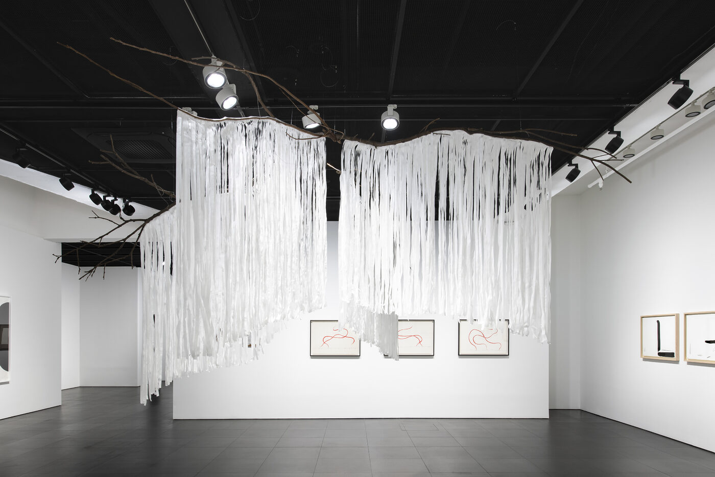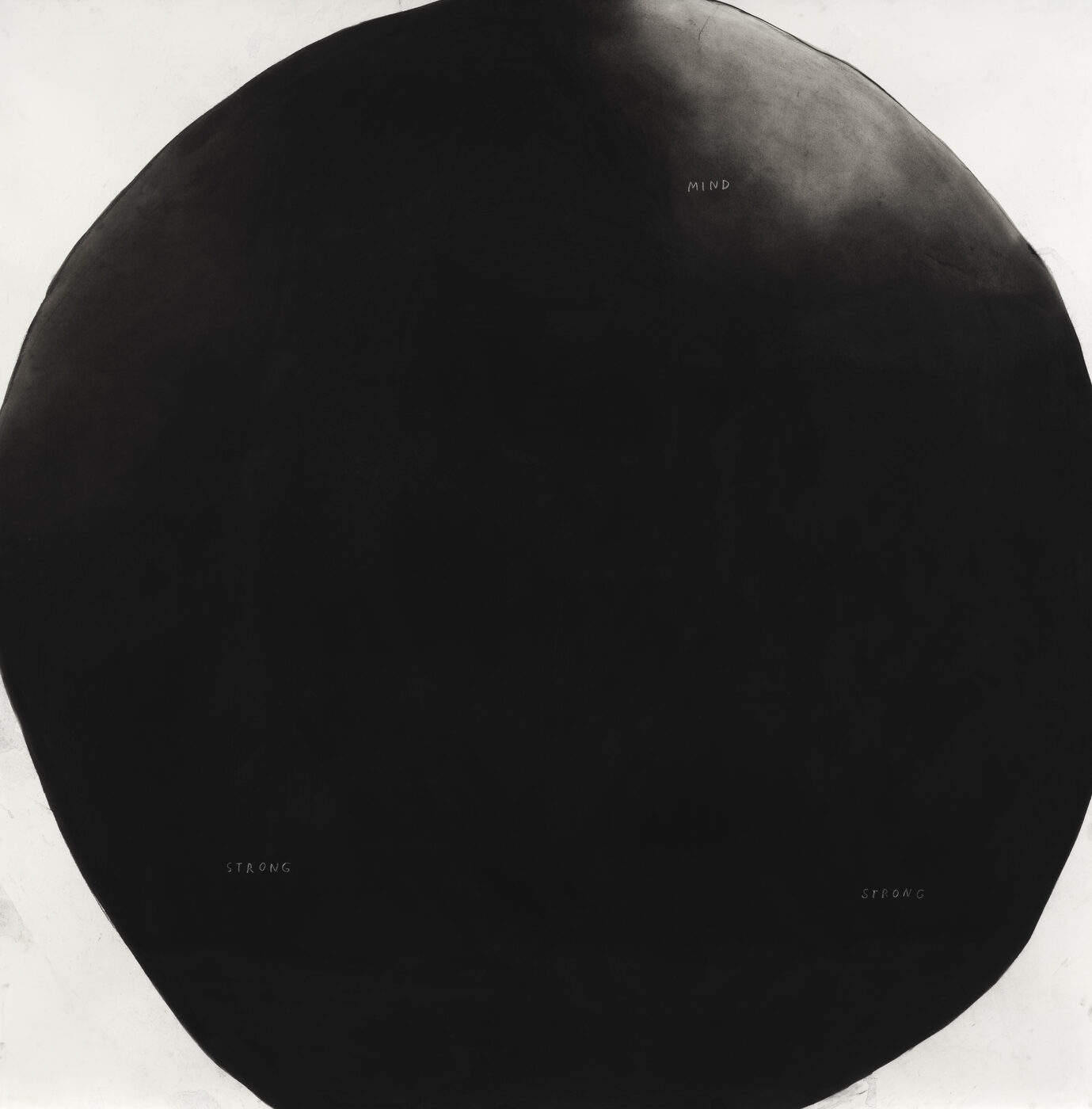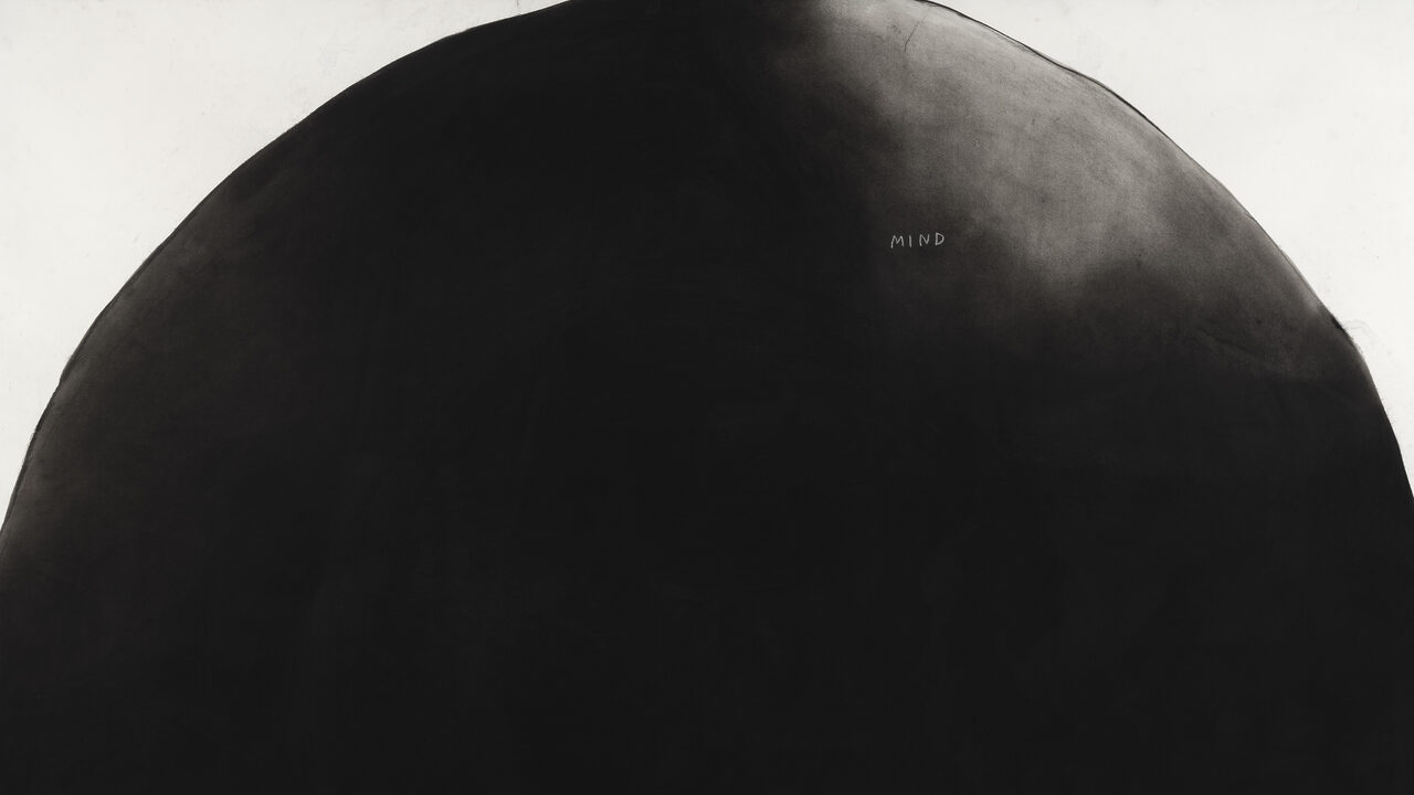 “김 크리스틴 선의 ‘Mind’ 시리즈는 미국 수어(American Sign Language)에서 ‘mind(마음/생각)’ 동작을 포함하는 여러 수어 표현을 시각화한 작업이다. ‘Mind Strong (2)’은 관자놀이를 두드린 뒤, 두 손을 주먹 쥐고 앞으로 밀어 ‘Strong(강함)’을 그려내 ‘완고함’, ‘생각이 굳어 변하지 않는 상태’를 표현한다. 작가는 종이 위에 목탄을 사용하며 화면에 자연스럽게 번짐과 얼룩을 남긴다. 작가는 이러한 ‘지저분함(messiness)’을 ‘시각적 배경음(visual ambient sound)’이라고 표현하며, 갤러리나 레스토랑에서 들리는 소란스러운 배경 소리에 비유한다. 화면에 남은 번짐과 손자국은 작가의 신체적 존재와 제작 과정이 기록된 흔적으로, 작품의 개념적 요소로 이해할 수 있다.”