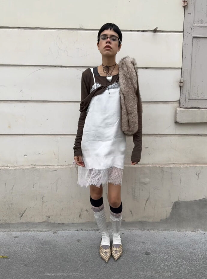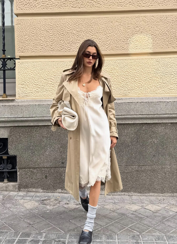 레이스가 트리밍된 여성스러운 슬립 드레스는 단연 연말 파티를 위한 최적의 아이템이에요. 하지만 이를 데일리 룩으로 입고 싶다면? 두꺼운 양말을 활용하세요. 이너에 심플한 톱을 레이어링해 더 실용적인 분위기를 연출한다면 금상첨화죠. 다소 섹시한 무드의 슬립 드레스에 소녀감성의 두툼한 롱 삭스를 신어 데이 & 나잇 모두 가능한 연말 룩을 완성해 보시길.