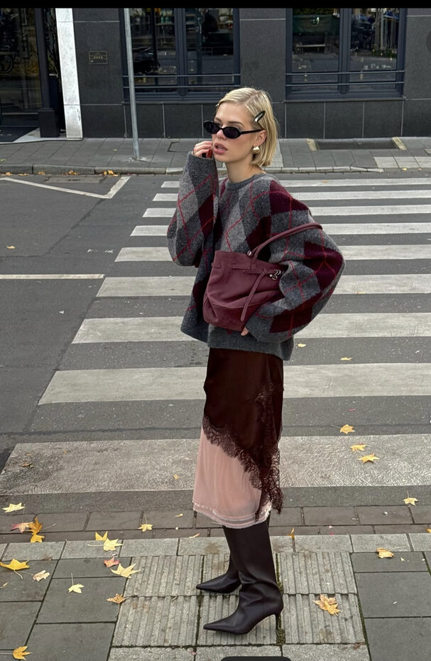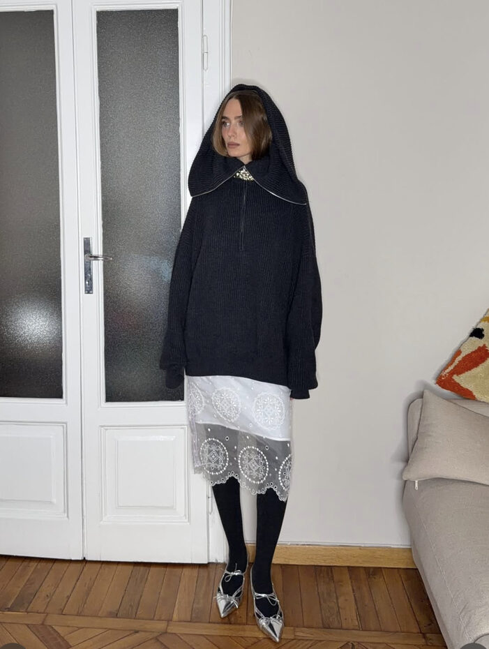 드레스만큼이나 패피들의 사랑의 받았던 실크 스커트입니다. 부드러운 실크와 섬세한 레이스 디테일의 스커트엔 두툼하고 포근한 무드의 오버사이즈 니트로 전혀 다른 질감의 소재를 매칭해야 더 세련되 보입니다. 두꺼운 스타킹에 힐을 신거나 롱 부츠를 신는다면 한겨울에도 이 하늘하늘한 스커트를 입을 수 있죠.