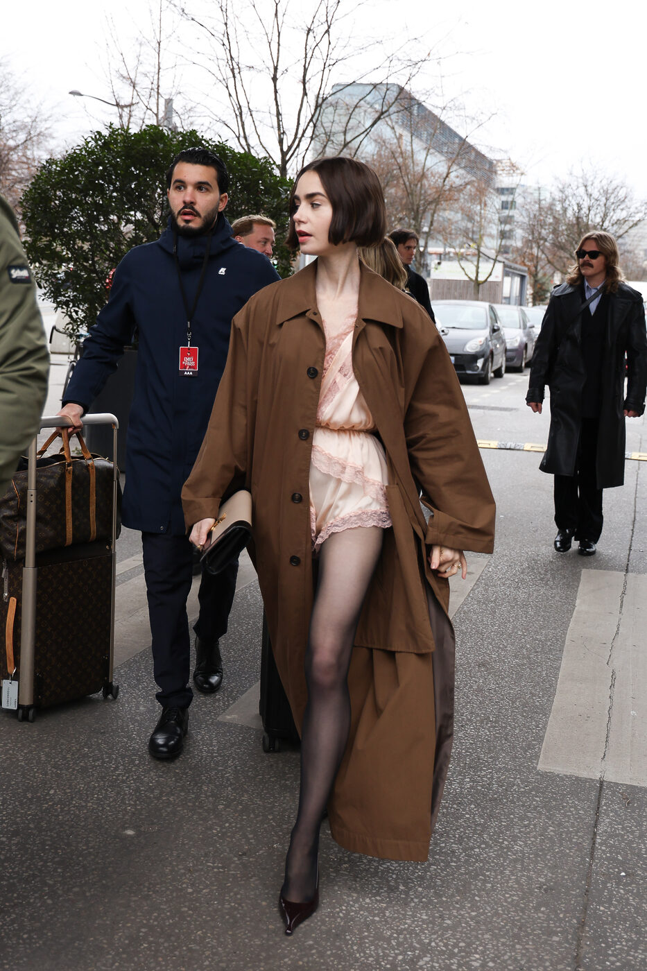 릴리 콜린 또한 생로랑의 란제리 점프 수트를 입고 성숙하고 매력적인 패션 감각을 뽐냈습니다. 피치 컬러의 레이스가 장식된 올인원 쇼츠를 입고 블랙 스타킹과 하이힐을 신은 과감하고 섹시한 모습이 돋보였어요. 그 위엔 오버사이즈 트렌치로 프렌치 감성의 란제리 스타일링을 선보였죠.