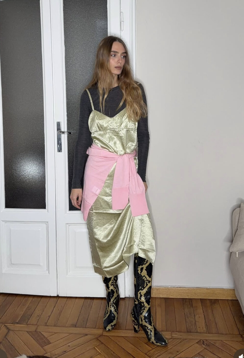가장 대표적인 란제리 스타일 아이템을 꼽으라면 바로 이 실크 슬립 드레스죠. 은근히 계절을 가리지 않고 다양한 레이어링과 스타일링이 가능해요. 한겨울에도 롱 슬리브 톱 위에 실키한 질감이 돋보이는 이 슬립 드레스를 입고 니트를 허리에 묶어 자유로운 분위기의 믹스매치 룩을 완성했어요. 애니멀 패턴의 부츠와 함께 민트 컬러와 핑크 니트의 컬러 매칭 또한 돋보입니다.