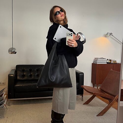 레더 팬츠가 시크하고 쿨한 매력을 담당한다면, 레더 미디 스커트는 우아하고 섹시한 방향으로 분위기를 만들어줘요. 미디 기장의 레더 스커트는 다리를 과하게 드러내지 않으면서도, 두툼한 아우터와 매치했을 때 전체 실루엣을 슬림하게 정리해주는 장점이 있어요. 추위가 걱정된다면 안에 타이츠나 스타킹을 더하고 부츠로 마무리해보세요.