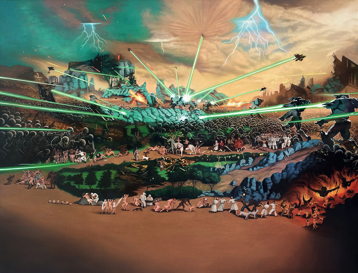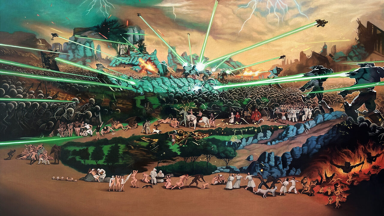 “유신애는 고전 유화에서 느낄 수 있는 정적인 빛과 디지털 이미지에서 보이는 즉각적이고 화려한 빛이 한 화면 안에서 맞부딪힐 때 발생하는 정서적 긴장을 포착한다. 이번 전시의 핵심 작품 ‘Ghetto Bouquet’는 제목이 암시하듯, 사회적 변두리와 고립을 상징하는 ‘게토(Ghetto)’와 서로 다른 꽃들이 모여 하나의 형태를 이루는 ‘부케(Bouquet)’를 병치한다. 이는 복잡한 목소리와 이야기들이 얽히며 형성되는 소문의 모호한 진실을 비유하며, 현대 사회의 연민, 소문 구조, 그리고 디지털 시대가 지닌 세속성과 성스러움의 이중성을 동시에 드러낸다.”