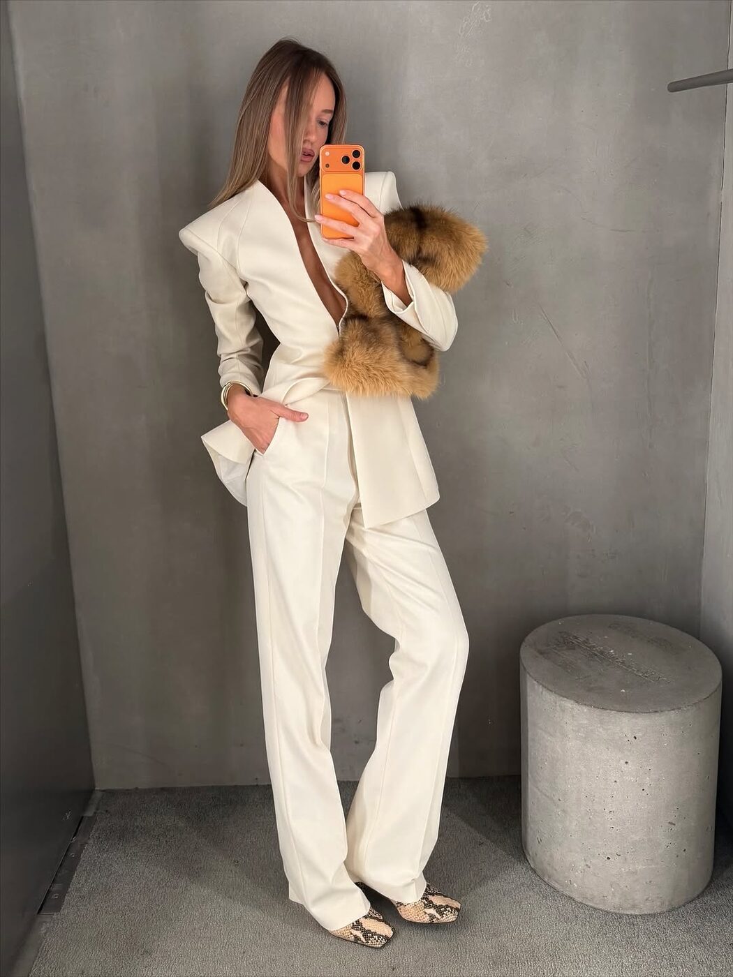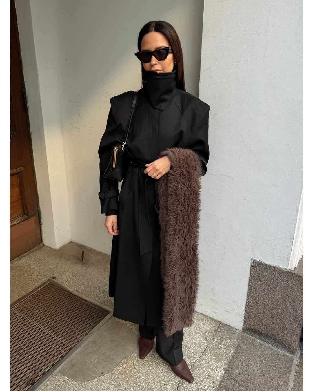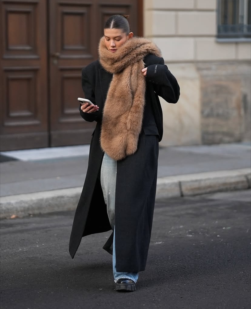 퍼 머플러에 가장 잘 어울리는 아우터는 각진 실루엣의 테일러드 롱 코트입니다. 부드러운 볼륨의 퍼 머플러와 코트의 구조적인 선이 대비를 이루면서 룩 전체가 세련되어 보이죠.
