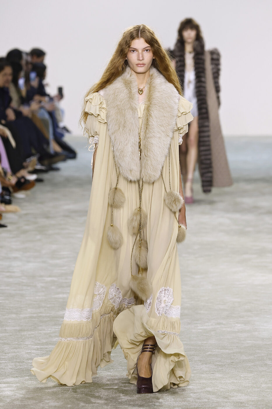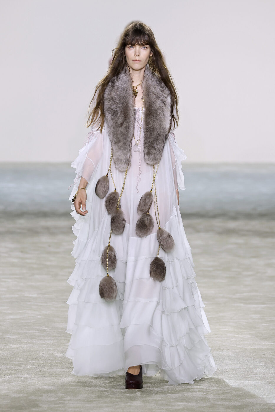 끌로에는 찰랑이는 러플 드레스 위에 퍼 머플러를 둘러 로맨틱한 보헤미안 무드를 한껏 살렸습니다. 체인과 방울 디테일이 더해져, 마치 거대한 주얼리를 두른 듯 시선을 사로잡는 효과까지 연출했죠.