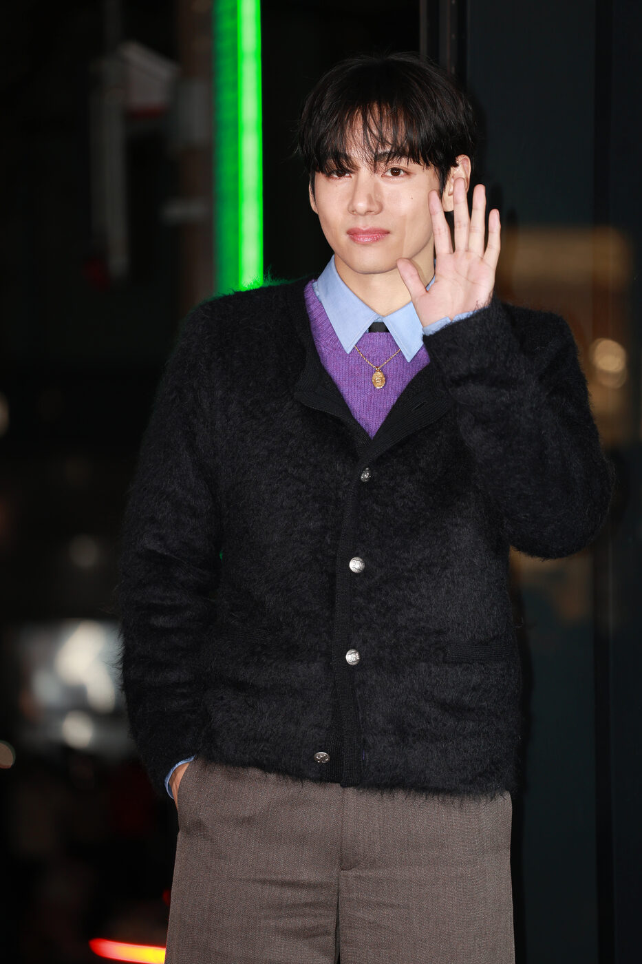 며칠 전 셀린 행사에 참석한 뷔. 블랙 가디건 안에 보라색 니트와 하늘색 셔츠를 덧입은 레이어링을 보여줬는데요. 겉에 입은 옷들은 블랙과 브라운으로 어둡지만 살짝 보이는 이너들이 밝은 컬러니 전체적으로 너무 무겁지 않고 경쾌해 보이기까지 합니다.
