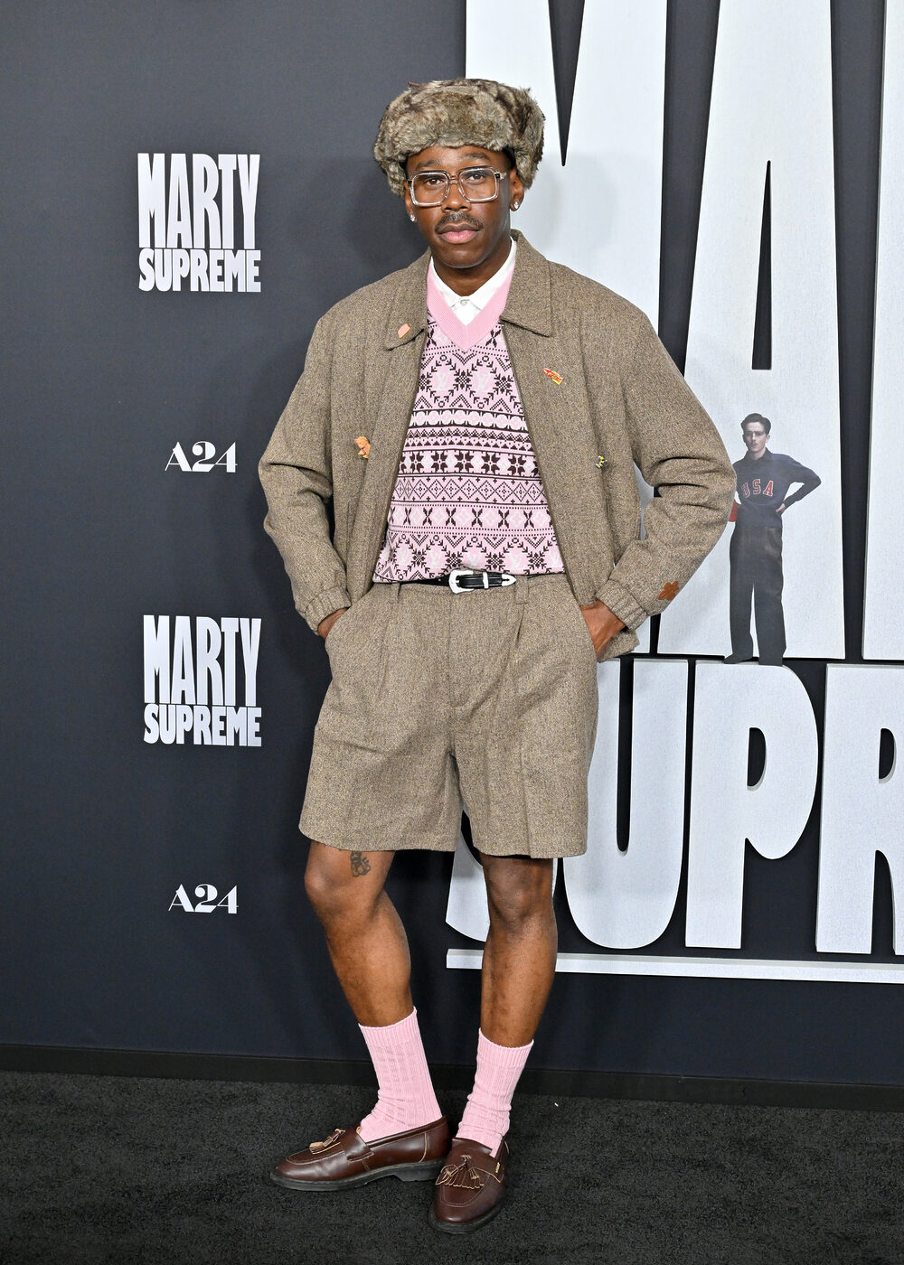 티모시와 같은 영화에 출연하는 타일러 더 크리에이터는 평소에도 컬러풀한 패션으로 유명한데요. LA 시사회에서 브라운의 클래식한 셋업을 입었는데 이너 니트와 양말을 핑크로 선택해 고루해 보이지 않게 연출했죠. 브라운과 연한 핑크 컬러도 조화롭게 잘 어울리네요.