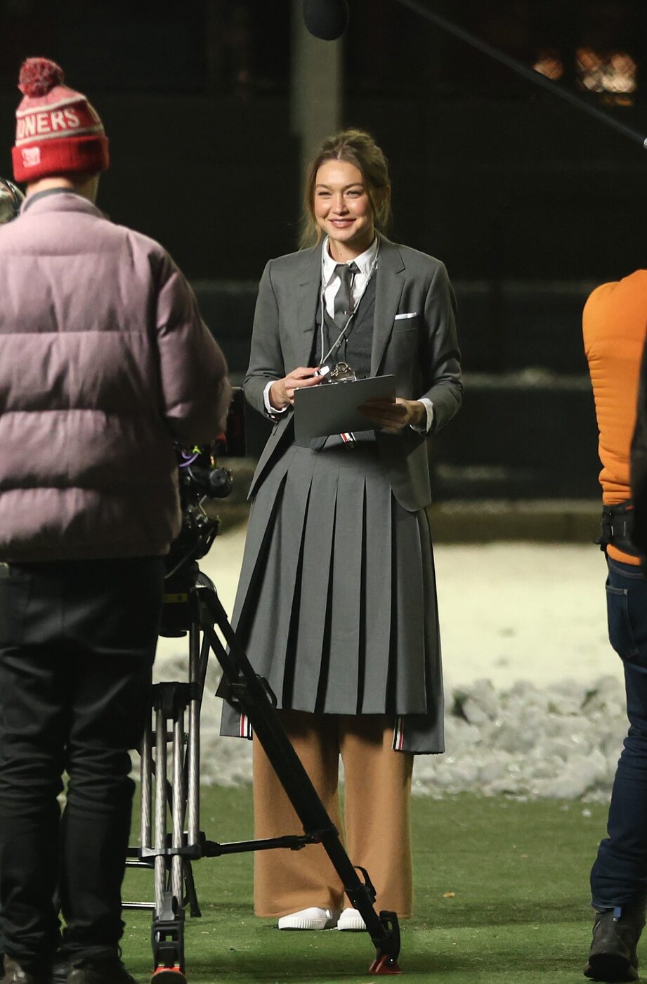 이렇게 어여쁜 학생이 있다면 옆 학교 남학생들이 가만히 있지 않을 것 같습니다. 다시 고등학생이 된 듯한 지지 하디드는 무릎까지 오는 착한 학생 스타일의 그레이 플리츠 스커트에 톰 브라운의 아이덴티티가 들어간 그레이 카디건와 그레이 재킷. 여기에 화이트 셔츠와 넥타이까지 제대로 갖춰 입고 촬영을 위해 등장했죠. 눈에 띄는 건 정갈한 스커트 아래 마치 겨울철이면 누구나 그랬듯, 체육복 바지를 입은 것처럼 자신의 트레이닝 팬츠를 입고 추위를 이기는 모습이었어요. 그 모습이 너무나 익숙해 정감이 가요.