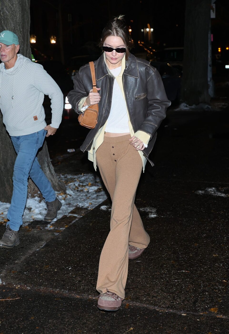 일이 끝나고 퇴근하는 모습의 지지 하디드. 프레피 룩 위에 걸쳤던 레더 재킷이 제 짝을 찾아 간 듯, 그와 완벽하게 어울리는 카멜 컬러의 캐시미어 트레이닝 팬츠와 화이트 톱, 그리고 아이보리 컬러의 롱 카디건을 레이어링했습니다. 자연스럽게 흘러내리는 실루엣의 옷차림은 독특하고 투박한 운동화와 작은 브라운 숄더 백을 매칭해 스타일리시한 꾸안꾸 룩을 선보였어요. 톱 모델의 여유가 느껴지는 오프 듀티 룩이었습니다.
