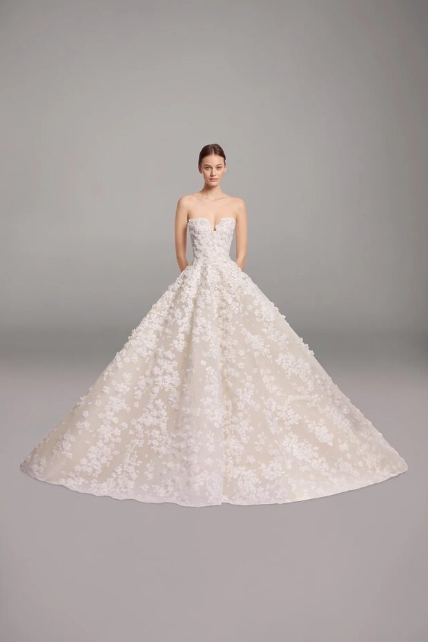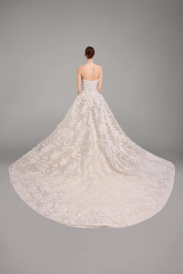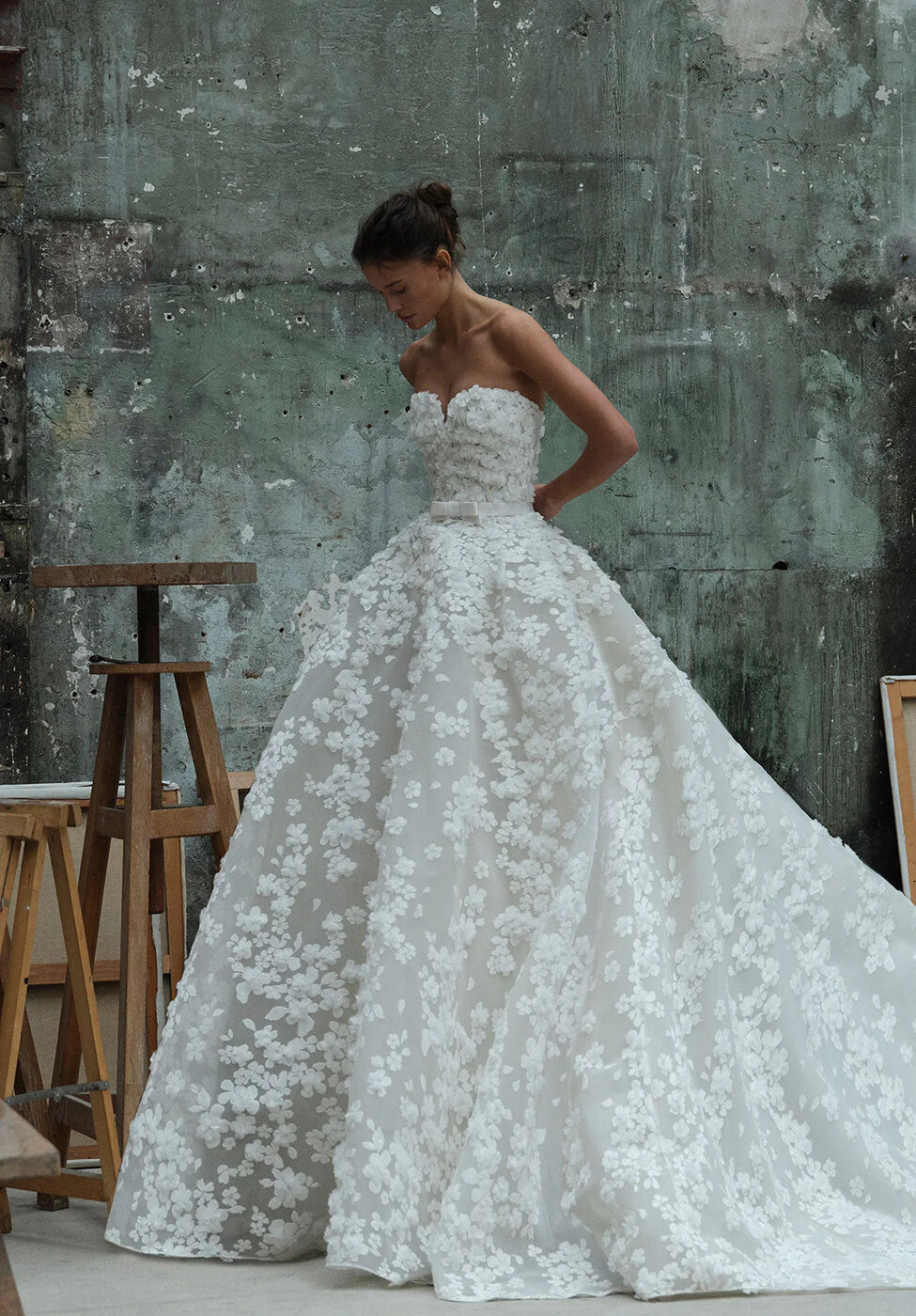 김우빈은 깔끔한 턱시도 수트로 정석적인 웨딩 룩을 완성했어요. 신민아의 드레스는 디테일로 가득했습니다. 입체적인 플라워 모티프로 가득한 화이트 드레스였죠. 비즈 소재의 화려함과는 다른 매력의 섬세한 드레스입니다. 수많은 플라워 장식은 룩의 완성도를 높였고, 하트 쉐이프의 네크라인과 풍성한 실루엣은 웨딩을 드라마틱하게 연출했어요.