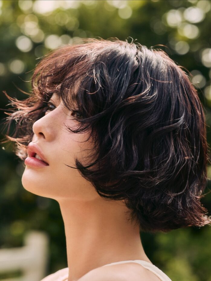 나나의 숏 펌은 사랑스럽고 자유로운 분위기가 공존합니다. 전체적으로 층을 내 가볍게 만들고, 굵은 컬이 이마를 부드럽게 감싸는 구조죠. 앞머리는 눈썹 아래에서 콧등에 닿는 길이로 커트해 작은 얼굴을 더 작아 보이게 연출했고요. 이 펌은 드라이 후 스타일링 제품을 약간 바르는 것이 더 좋은데요. 자칫하면 부스스하게 텍스처가 다 일어나 부스스하고 얼굴도 커 보일 수 있습니다. 스타일링 제품을 소량만 사용해 부피감을 줄여주는 것이 차분하고 세련되어 보입니다.