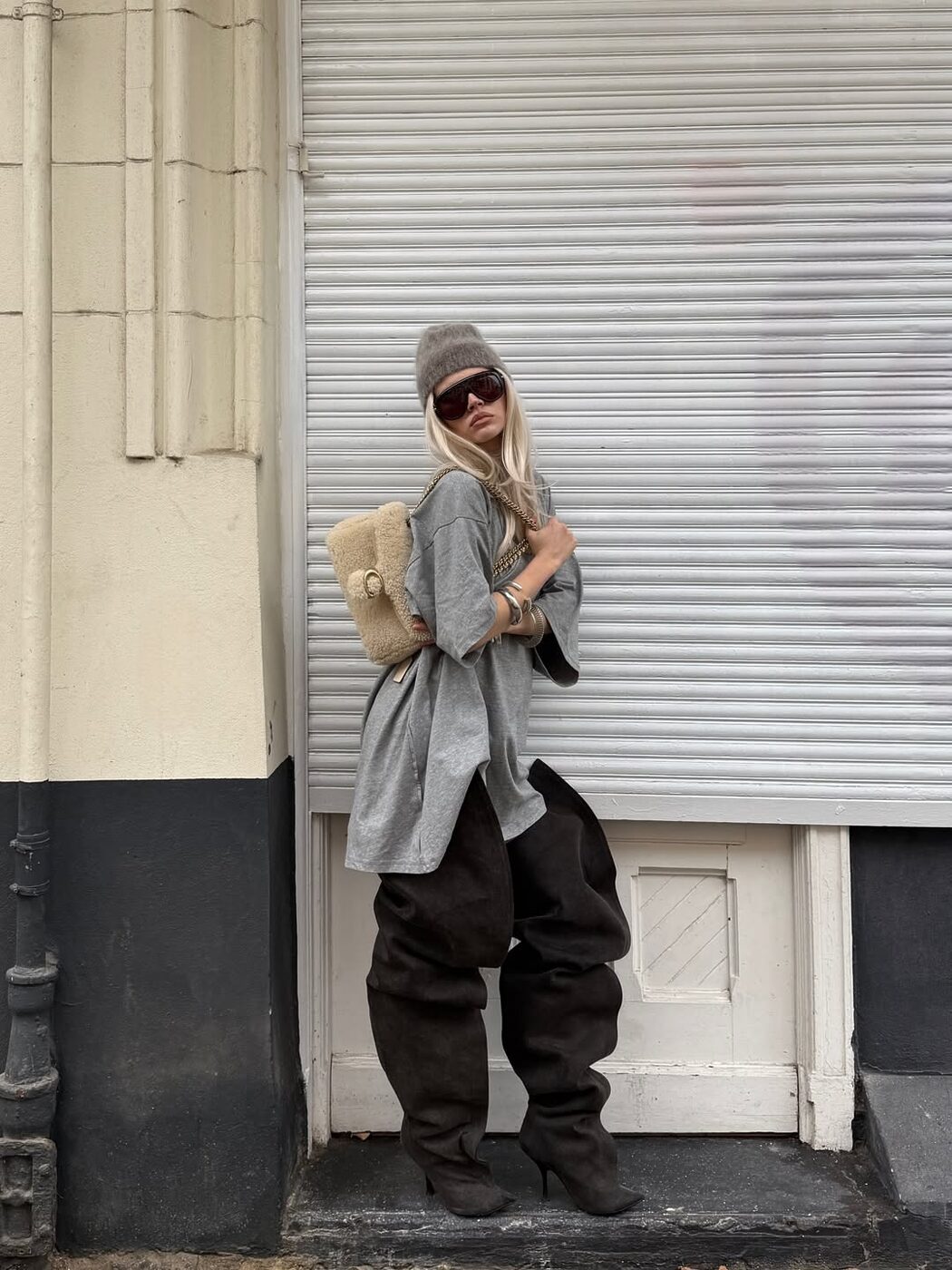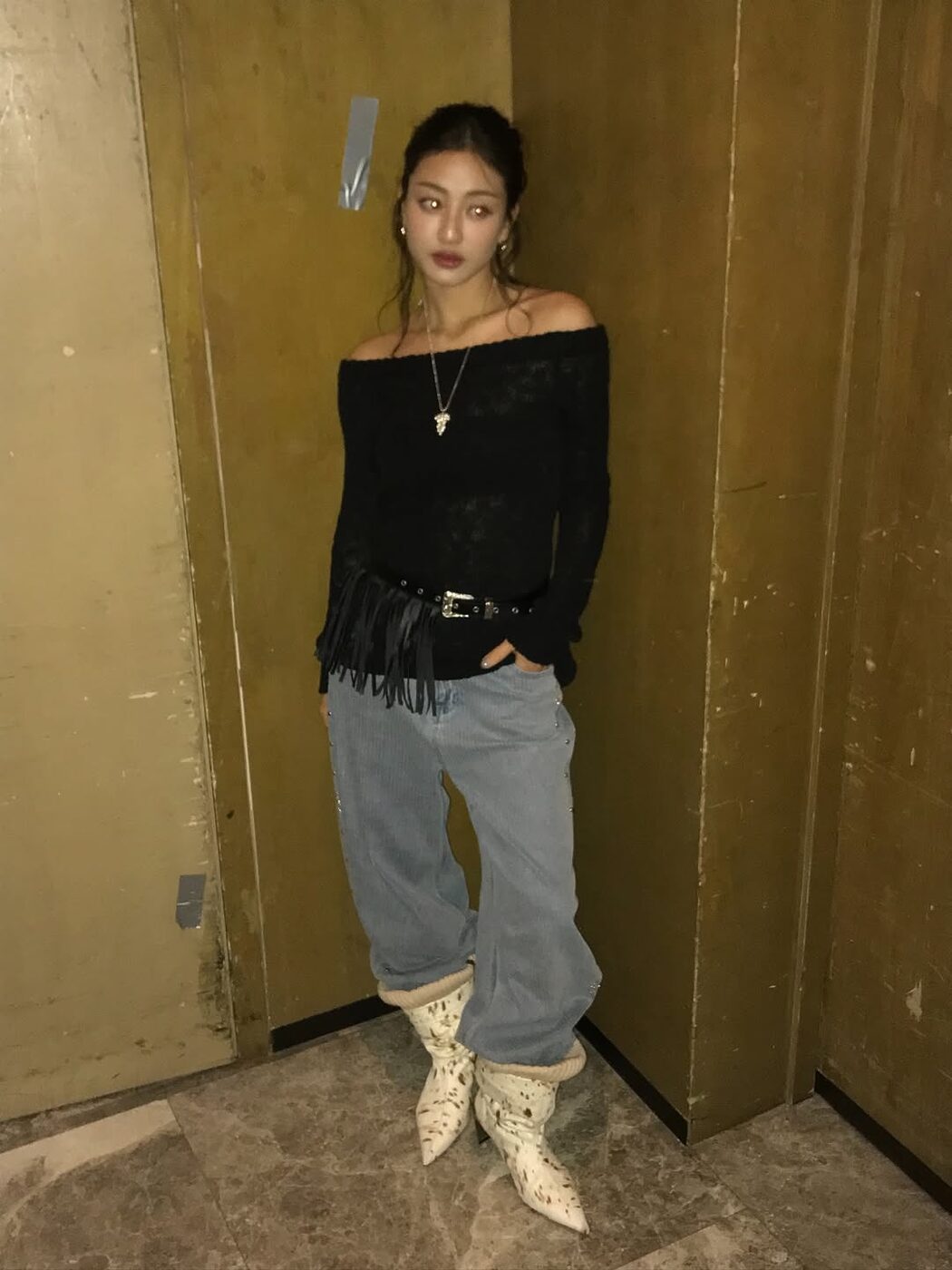 그렇다면 슬라우치 부츠를 어떻게 연출해야 할까요? 특유의 흘러내리는 듯한 자태를 의상에서부터 슈즈까지 물 흐르듯 이어지도록 연결하는 것이 바로 스타일링 포인트! 디지털 크리에이터 ‘girlcalledluca’는 오버사이즈 톱에 하의는 과감히 생략하고 H&M X 글렌 마틴스 협업 컬렉션의 슈퍼 하이 슬라우치 부츠를 매치해 대담한 드레싱을 완성했어요. 보다 더 웨어러블한 연출법은 트와이스 지효에게서 찾아볼 수 있는데요. 헐렁한 데님 팬츠에 (스니커즈 대신) 슬라우치 부츠와 프린지 벨트로 포인트를 줘, 자칫 평범할 수 있던 룩을 보다 감각적으로 드레스업한 것을 확인할 수 있답니다.