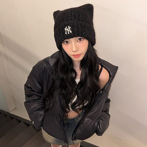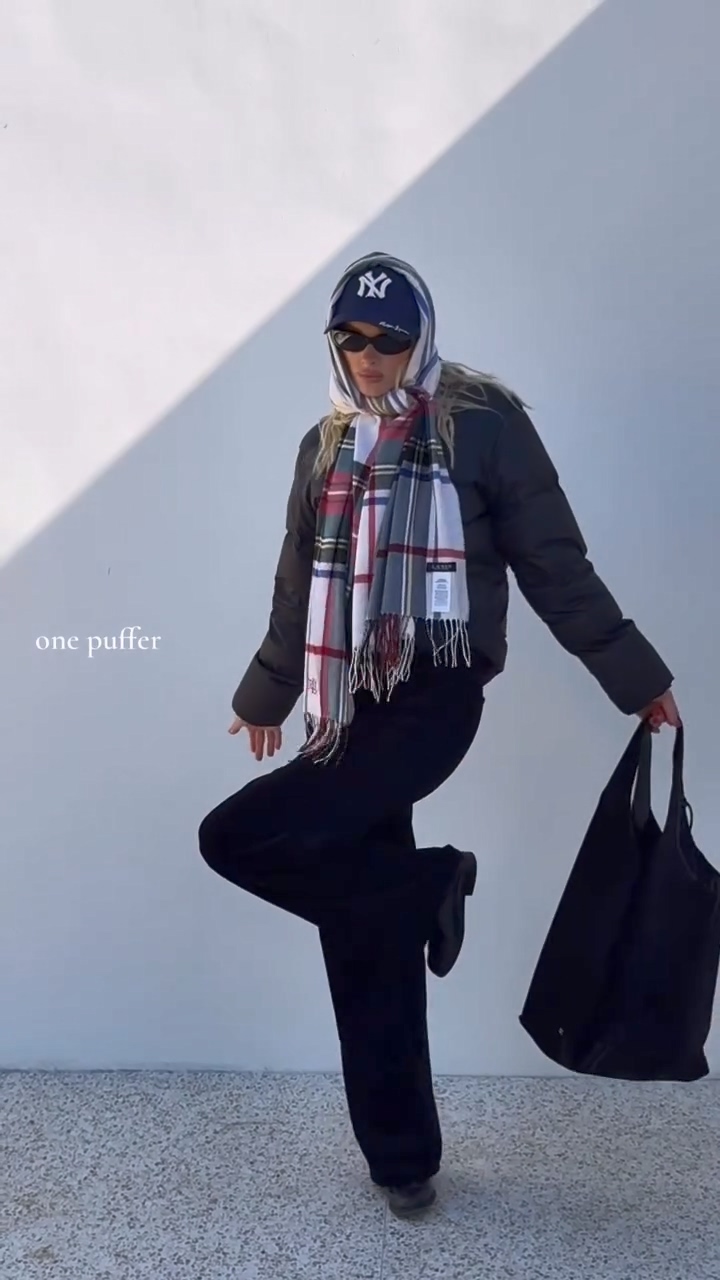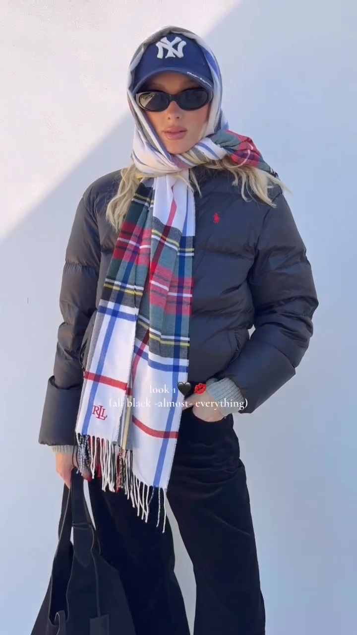 이제 조금 캐주얼한 방향을 살펴볼까요? 겨울에 자주 입는 숏 패딩과 체크 목도리! 야구 모자 위로 둘러주니 캐주얼한 룩 특유의 발랄함이 살아납니다.