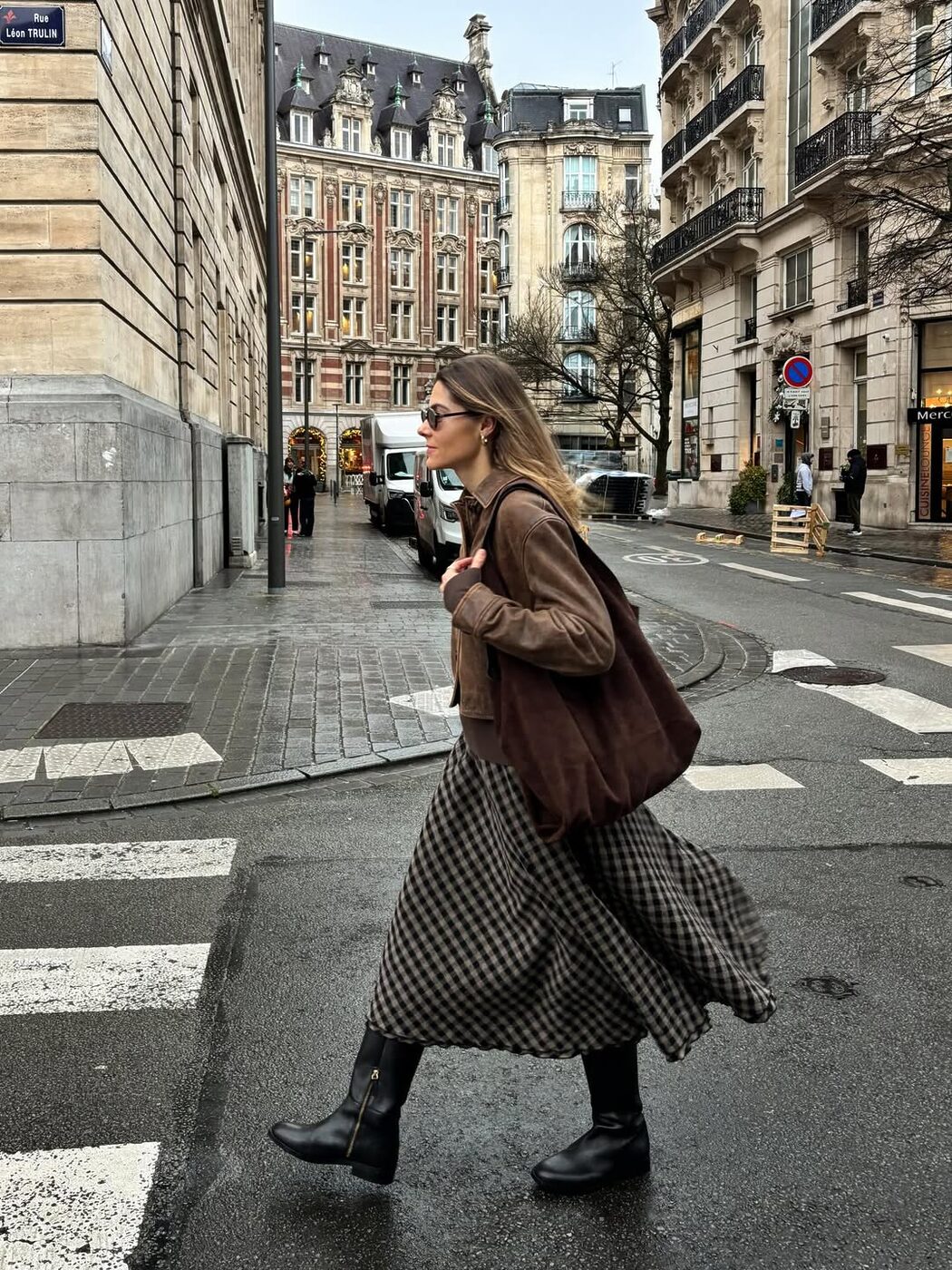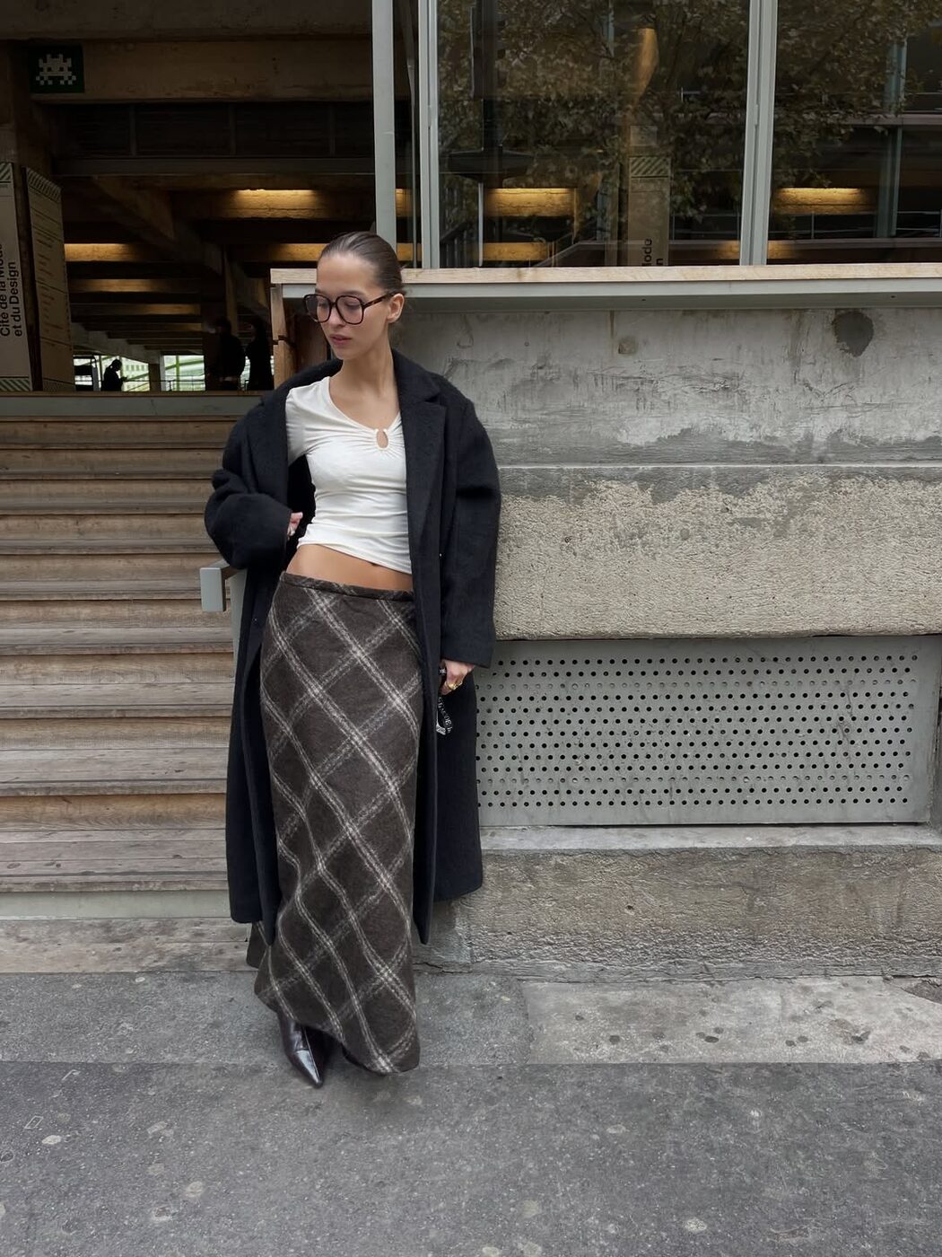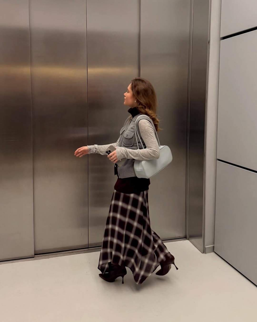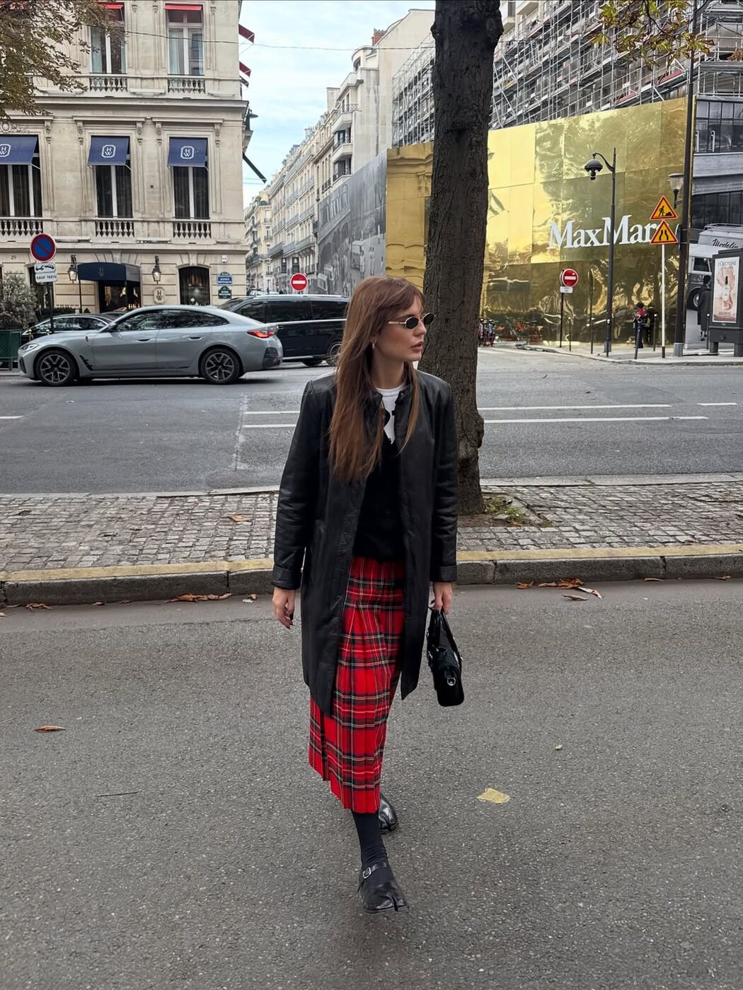 기장 선택도 중요해요. 무릎 아래로 내려오는 미디 기장 체크 스커트는 캐주얼부터 포멀까지 활용도가 가장 높고, 롱부츠나 앵클 부츠와도 잘 어울려요. 반면 발목까지 오는 맥시 기장의 롱 체크 스커트는 한층 차분하고 성숙한 무드를 만들어줘서 우아한 분위기를 연출하고 싶을 때 좋아요.