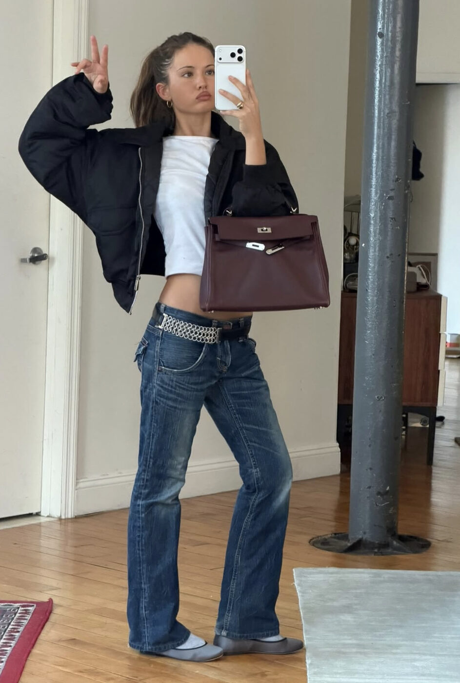 장르를 섞는 것, 새로운 새깅룩을 가장 시크하게 입는 법입니다. 스트레이트 핏의 로우 라이즈 진에 청키한 벨트를 착용하고, 그 위엔 캐주얼한 톱과 재킷을 입었다면 신발은 양말에 발레 슈즈를 신어 소녀감성을 더했어요. 그리곤 클래식한 토트 백으로 오묘한 조합을 완성했죠.