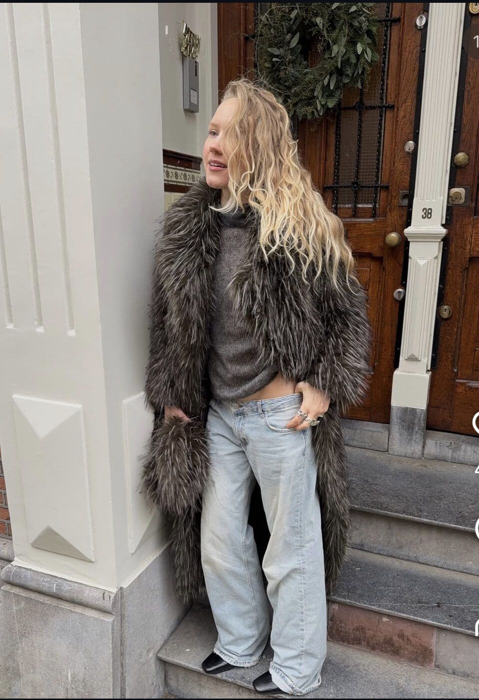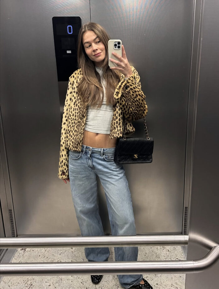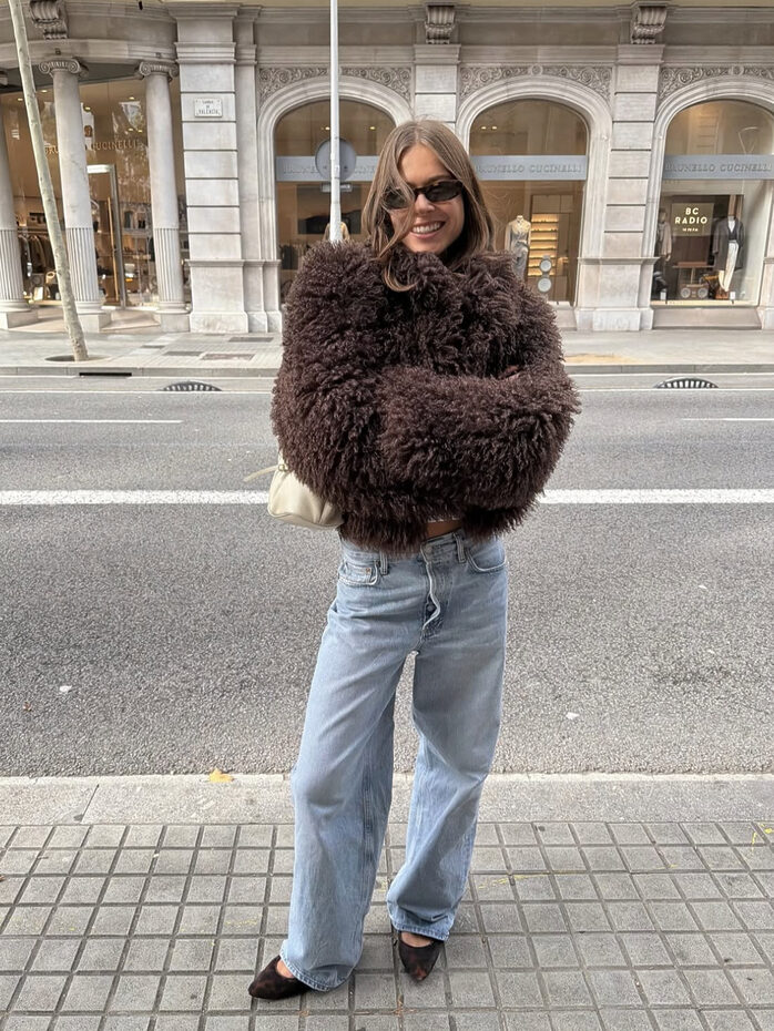 로우 라이즈진과 가장 잘 어울리는 아우터는 뭐니뭐니해도 보헤미안 스타일의 퍼 코트가 제격입니다. 왠지 모르게 삐딱해 보이는 이 데님과 팬츠엔 화려한 퍼가 화룡점정을 이루죠. 청바지는 살짝 배기한 스타일로, 골반 뼈에 걸쳐 은근히 옆구리가 드러난다면 완벽해요.