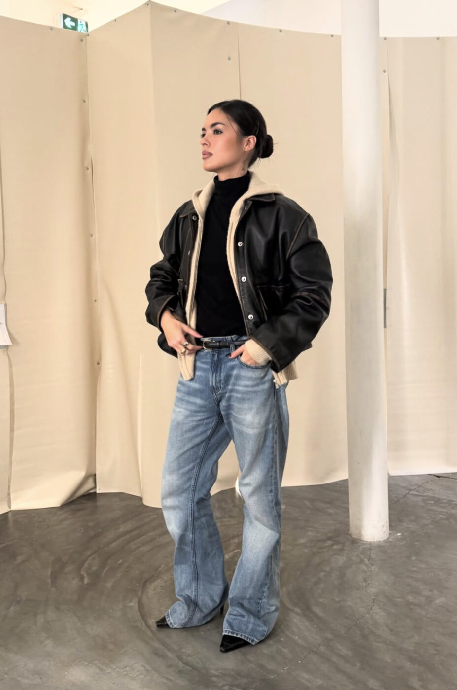 한겨울에 맨 살은 드러내기 싫지만 새깅룩은 입고 싶다? 그렇다면 몸에 착 붙는 타이트한 톱을 활용하세요. 심플한 블랙 스킨 톱에 허리를 쭉 내려 입은 플레어 진을 입었다면 신발은 앞 코가 뾰족한 하이힐이나 부츠로 새침하고 시크한 무드를 연출해도 좋습니다. 은근히 반항적인 분위기엔 레더 재킷이 완벽한 궁합을 이루죠.