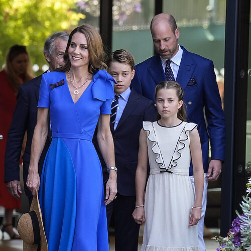 예로부터 왕실 패션에서는 컬러가 중요한 역할을 합니다. 상징적이고 눈에 잘 띄는 색을 입고 대중들에게 존재감을 드러내곤 했죠. 케이트가 중요한 날이 꼭 선명한 색의 옷을 입는 이유예요. 심플하고 구조적인 디자인의 새파란 코트와 모자가 위엄을 드러냅니다. 왕자들은 네이비톤의 룩에 블루 타이와 체크 팬츠로 포인트를, 샬럿 공주는 아빠의 카키색 타이와 컬러를 맞춘 베이비돌 코트를 입고 조화를 이뤘어요.