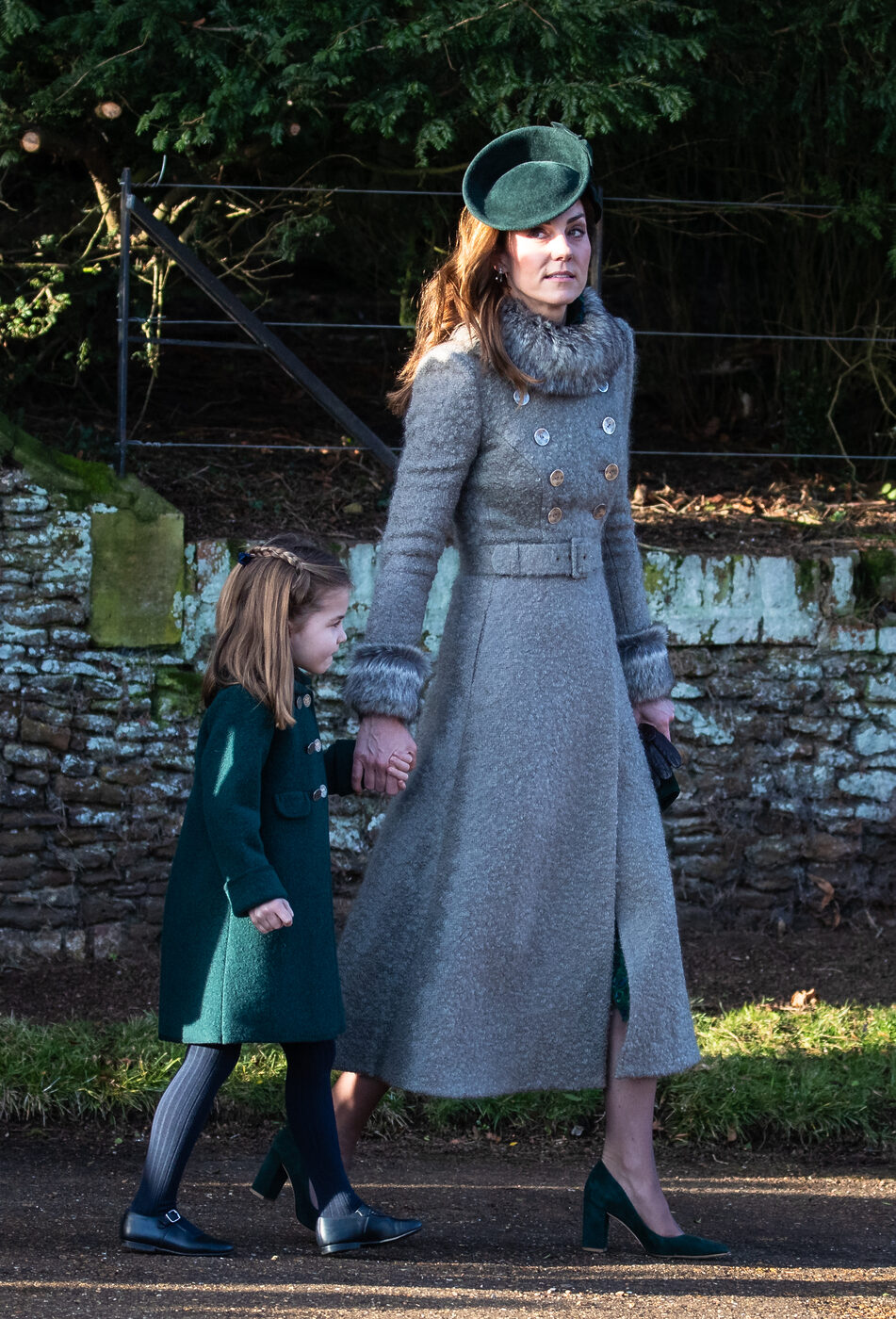 늘 허리를 강조한 A라인의 롱 코트를 입고 크리스마스 예배에 참석하는 케이트. 퍼 트리밍이 돋보이는 그레이 벨티드 코트에 초록색 헤드 피스로 컬러 포인트를 준 룩과 엄마의 모자와 같은 초록색의 코트를 입은 어린 공주의 모습이 사랑스럽네요.