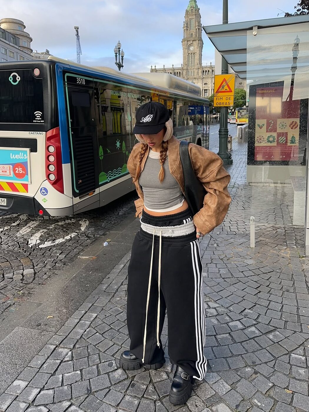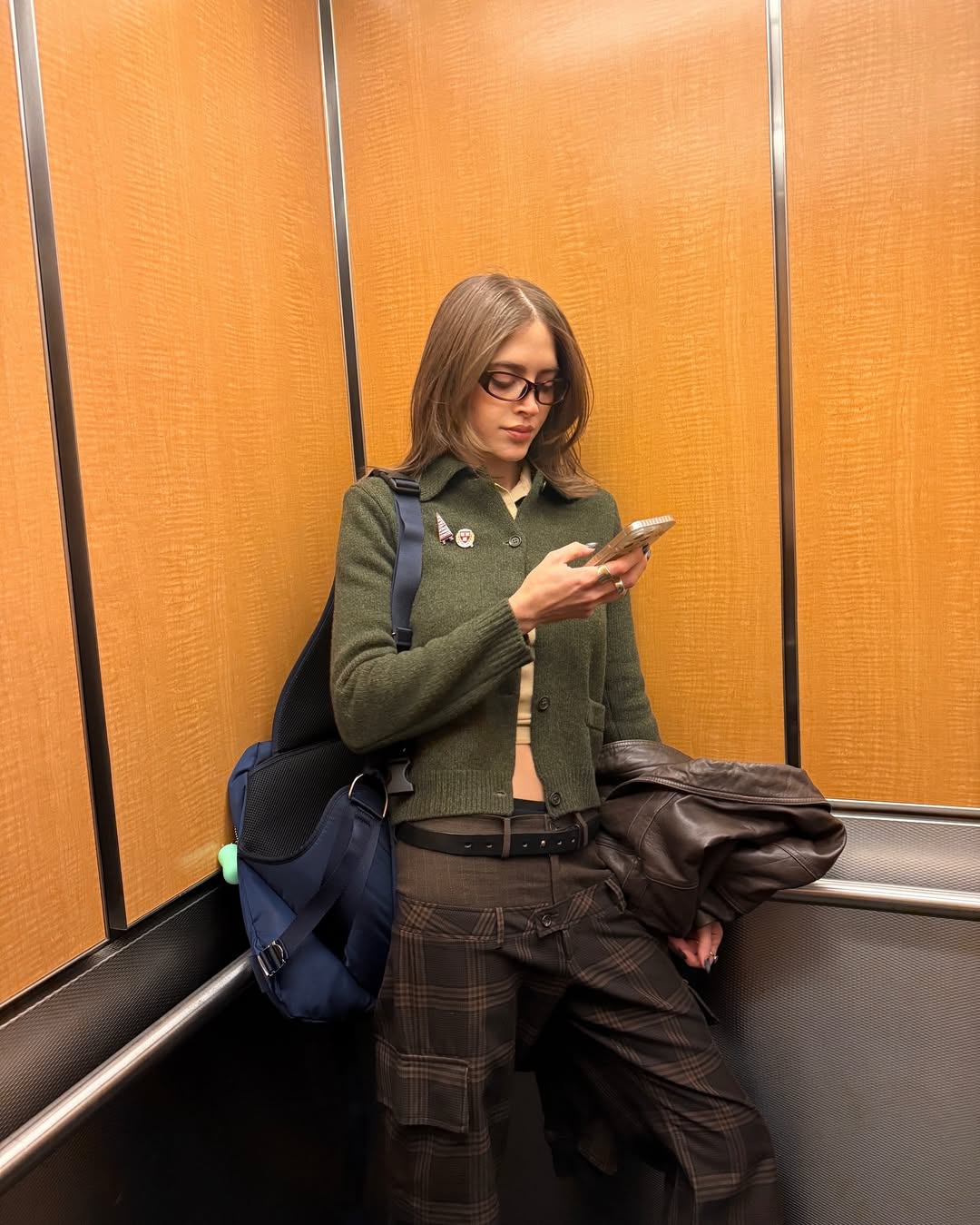 단정한 상의와의 조합 역시 겨울 새깅을 세련되게 만드는 방법 중 하나. 헤이즈는 니트 카디건에 체크 패턴이 겹쳐진 듯한 새깅 팬츠를 매치했는데요. 허리선을 낮춘 대신 상의는 크롭으로 정리해 비율을 살리고, 안경과 백팩 같은 액세서리를 더해 지적인 분위기를 강조했죠. 새깅이 과감해야만 성립된다는 고정관념을 깼습니다.