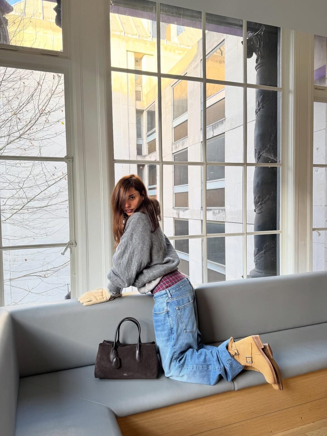 얇은 티셔츠 하나로 승부를 보던 계절과 달리 상의에 볼륨이 더해지는 겨울에는 하의와의 균형이 중요합니다. 내려 입은 데님 팬츠 사이로 체크 패턴 이너를 살짝 드러내고 투박한 워크 부츠와 니트, 그리고 가죽 백을 더해 캐주얼하면서도 클래식한 무드를 동시에 살렸어요.