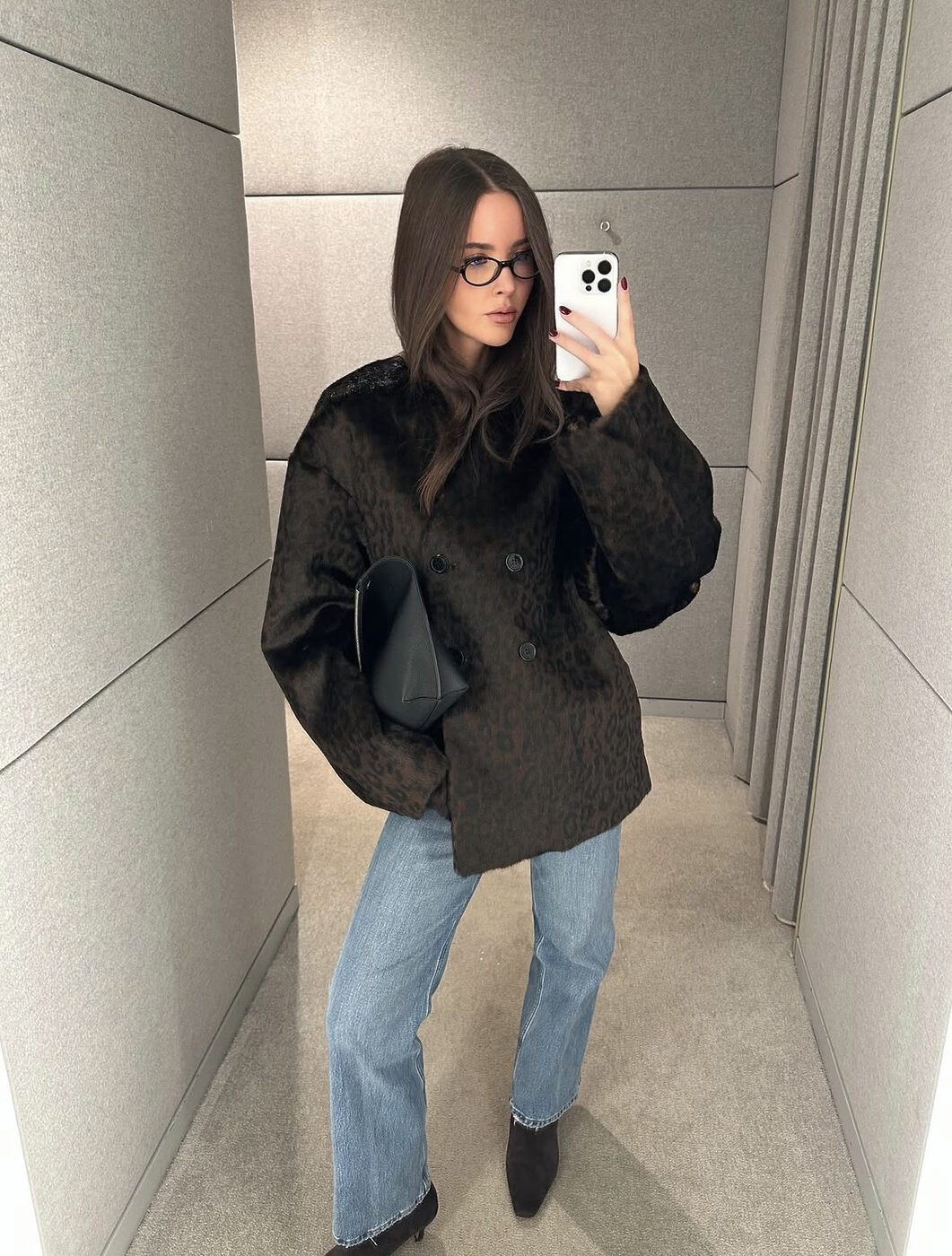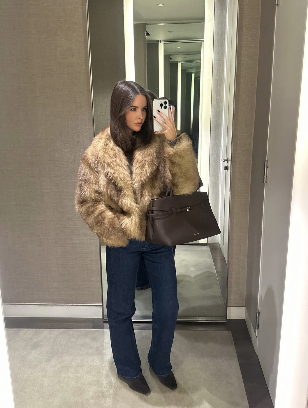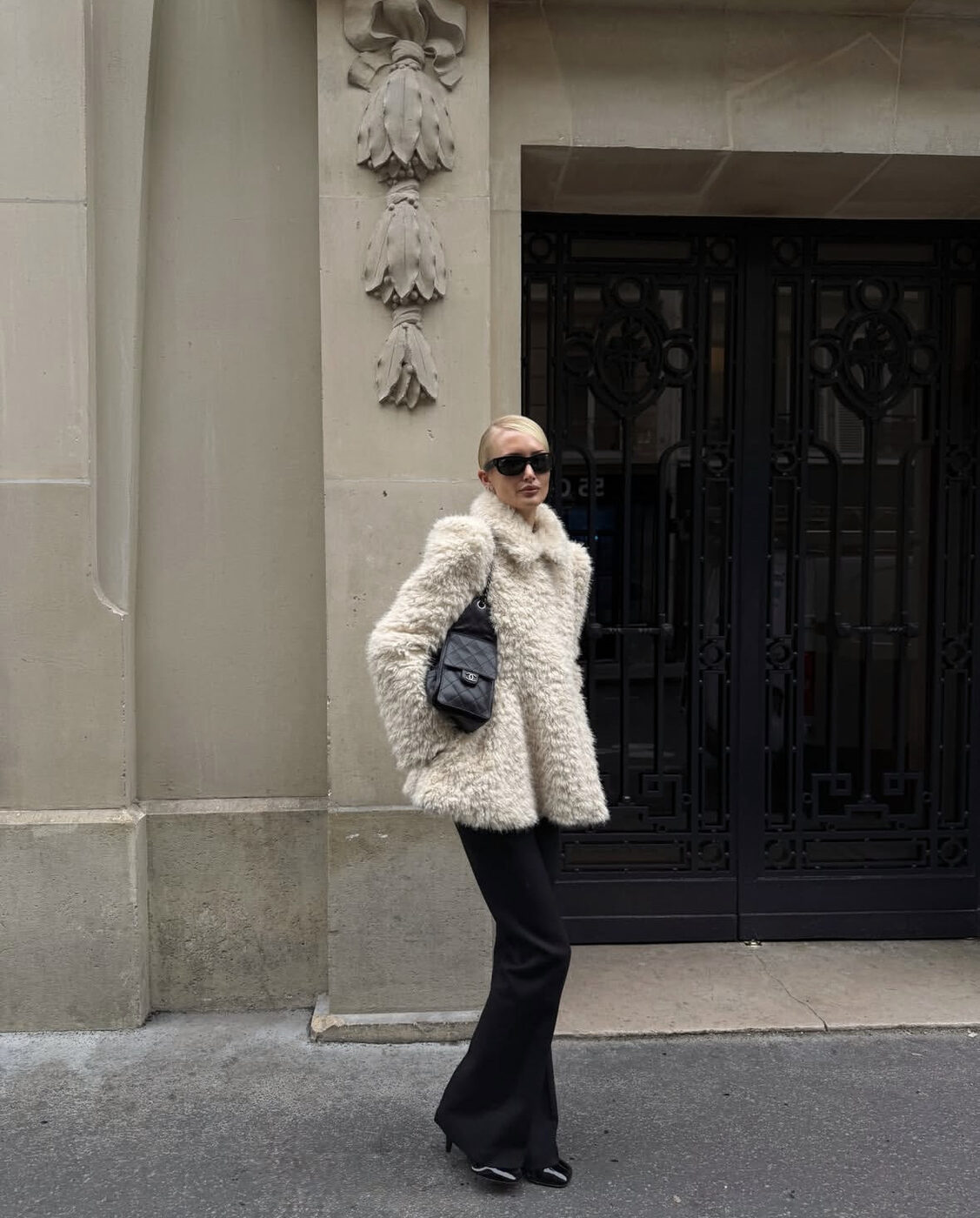 패션 인플루언서이자 스타일리스로 활동 중인 클로이 맥긴리도 이 코트를 즐기는 이들 중 한 명입니다. 그가 선택한 건 허리선 위로 딱 떨어지는 숏 기장. 아이보리 컬러의 가운형 짧은 코트에는 슬림한 데님과 로퍼를 매치해 깔끔하게 연출했고요, 퍼 코트 역시 같습니다. 하의는 모두 스트레이트 핏의 청바지로 미니멀하게 조절했네요.