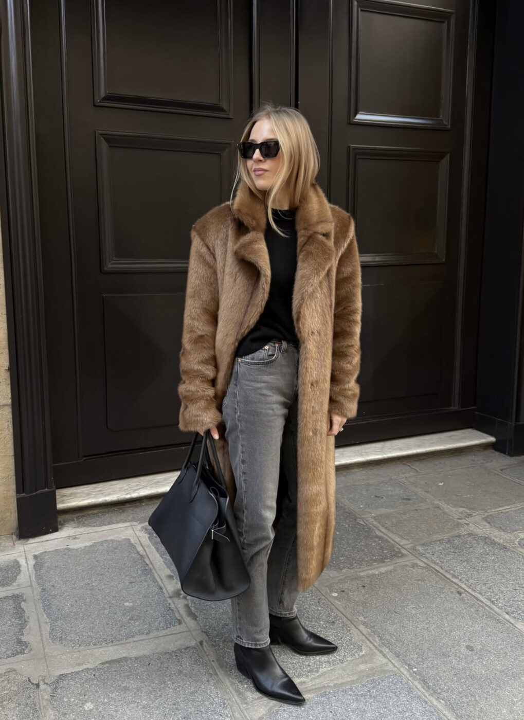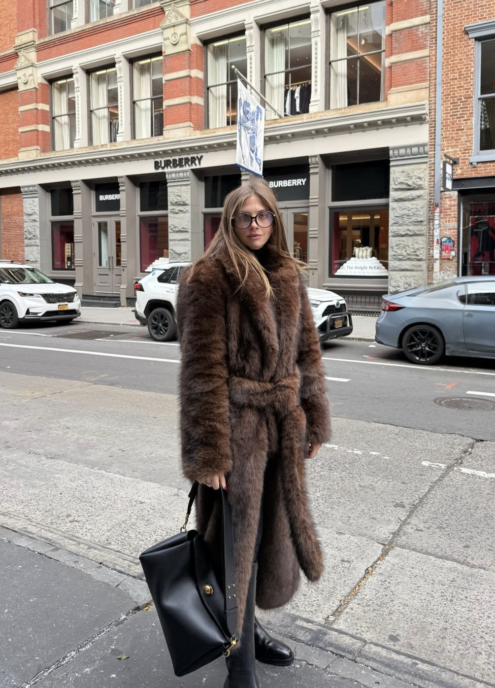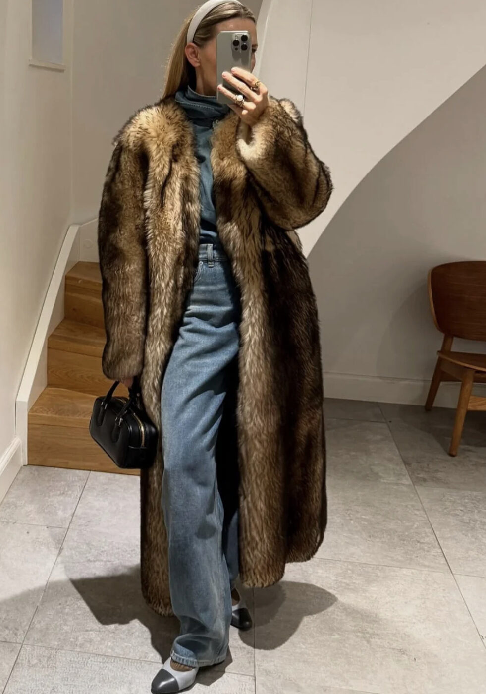 당장 눈밭을 굴러도 좋을 풍성한 브라운 퍼 코트를 입었다면 신발과 가방을 잘 골라야 합니다. 너무 투박하거나 캐주얼하지 않게, 그렇다고 너무 글래머러스한 스타일 또한 촌스러워 보일 수 있어요. 심플한 블랙 라이딩 부츠와 미디움 사이즈의 블랙 숄더 백 정도면 완벽하죠.