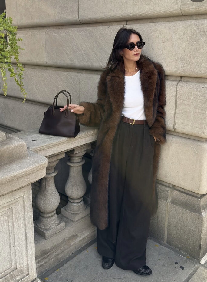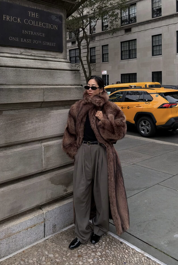 부드럽고 따스한 브라운 퍼 코트로도 차도녀 스타일의 시크한 룩이 가능할까요? 네, 블랙 톱과 그레이 스키니진 그리고 모던함의 절정을 선보일 빅 백과 슬림한 앵클 부츠까지 신어준다면 그 위에 복슬복슬하고 포근한 브라운 퍼를 걸쳐도 충분히 카리스마가 넘치죠.