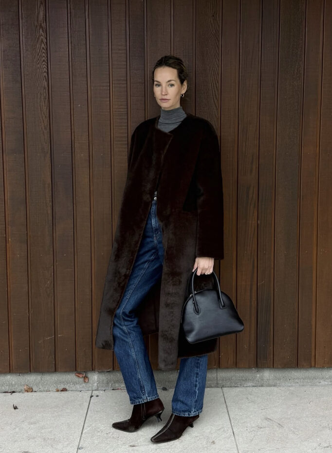 실제 모피를 사용한 듯한 빈티지 무드가 물씬 풍기는 A라인의 브라운 퍼 코트엔 밑단이 퍼진, 부츠 컷 데님이 완벽한 궁합을 이룹니다. 진한 브라운과 진한 데님의 컬러 조합과 더불어 플레어 라인의 어울림이 선사하는 레트로한 감성이 마치 유럽 어느 도시의 겨울을 떠올리게 하죠. 전체적인 몸의 라인 또한 길고 날씬하게 만들어 줍니다.