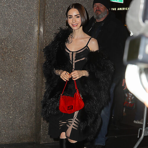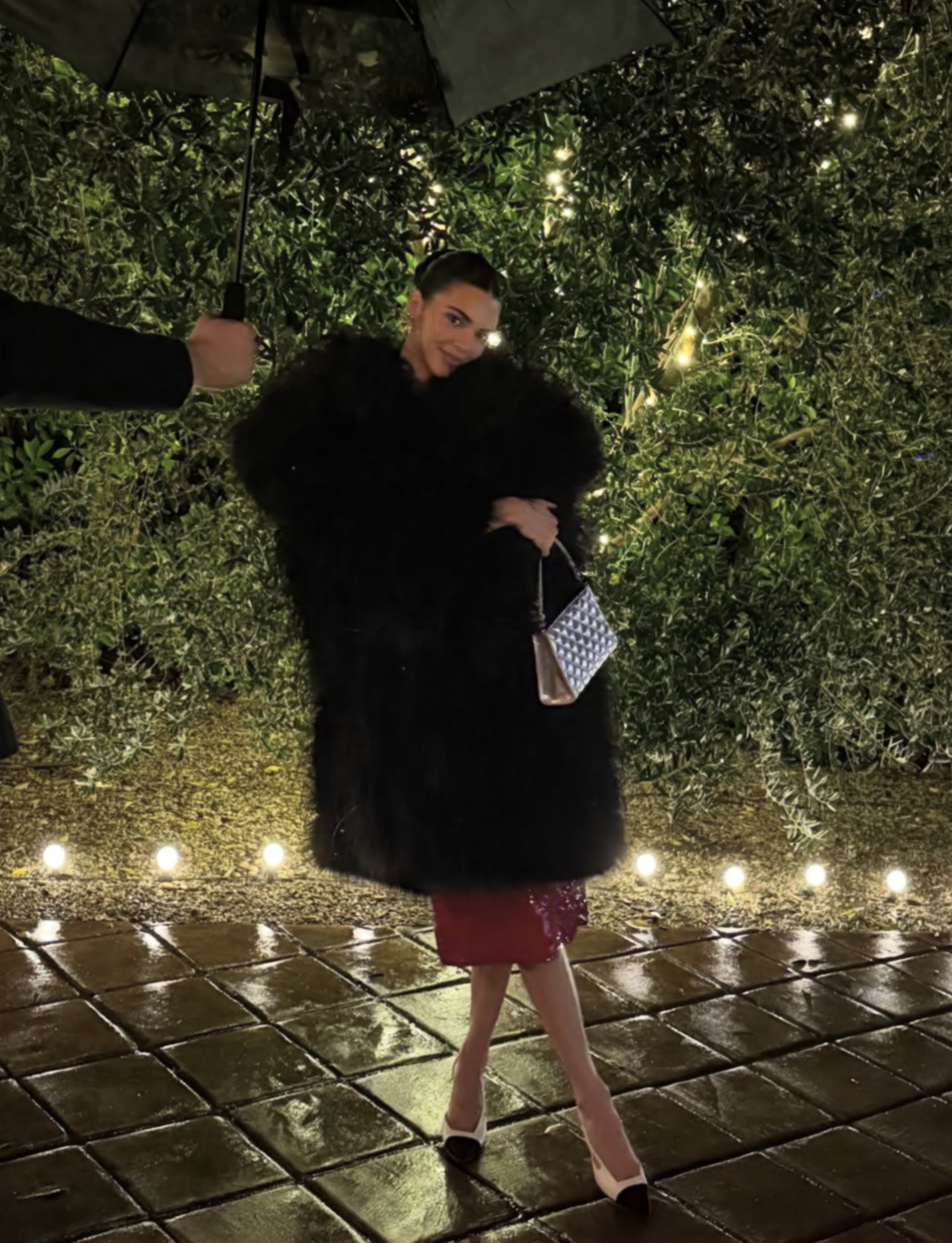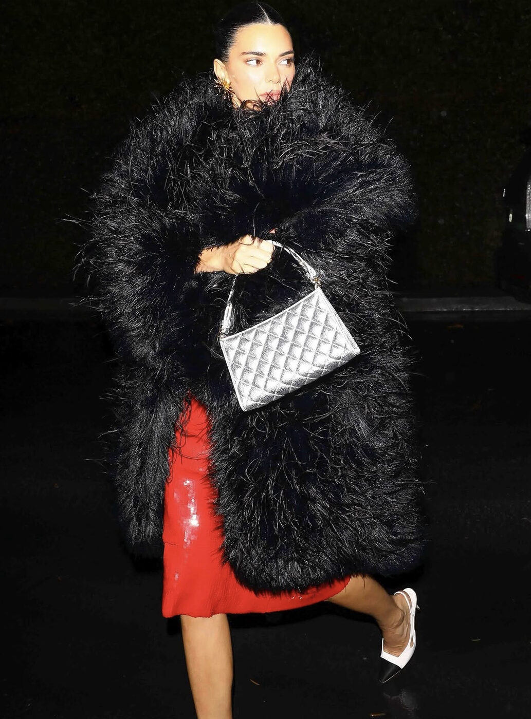 고전미가 넘치는 드레스와 화려한 퍼 아우터로 예전 헐리우드 여배우들의 포스를 뽐낸 켄달. 과장된 브이넥 라인이 돋보이는 강렬한 레드 글리터링 드레스는 의외로 심플하고 모던한 분위기를 선사합니다. 그 위엔 온 몸을 덮을 정도로 풍성하고 화려한 블랙 퍼 코트로 글래머러스함의 극치를 선보였죠.