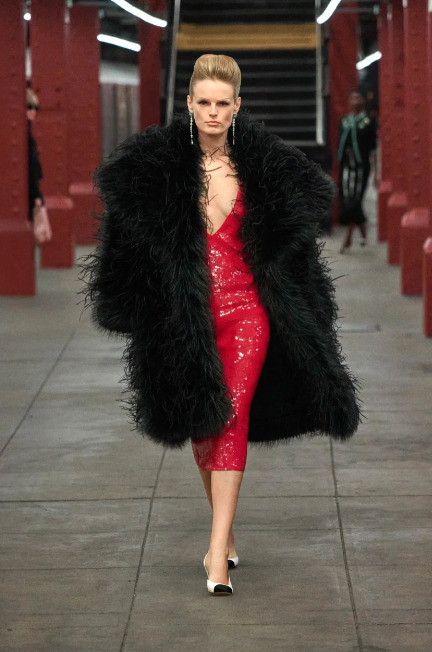 생동감 넘치는 길이가 긴 퍼를 사용한 오버사이즈의 블랙 코트가 드라마틱한 분위기를 연출해줬어요. 무릎를 덮는 미디 길이의 새빨간 시퀸 드레스와 그 보다 좀 더 짧은 중간 길이의 블랙 퍼 코트로 감각적인 매칭을 선보인 룩은 가장 클래식하고, 우아한 패션 하우스의 정수를 담은 액세서리로 마무리를 했습니다.