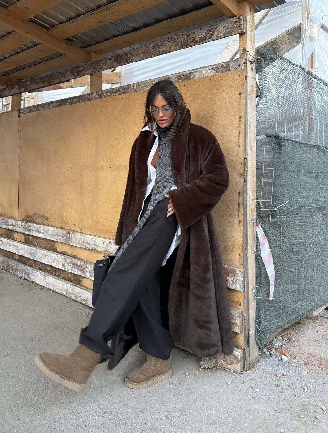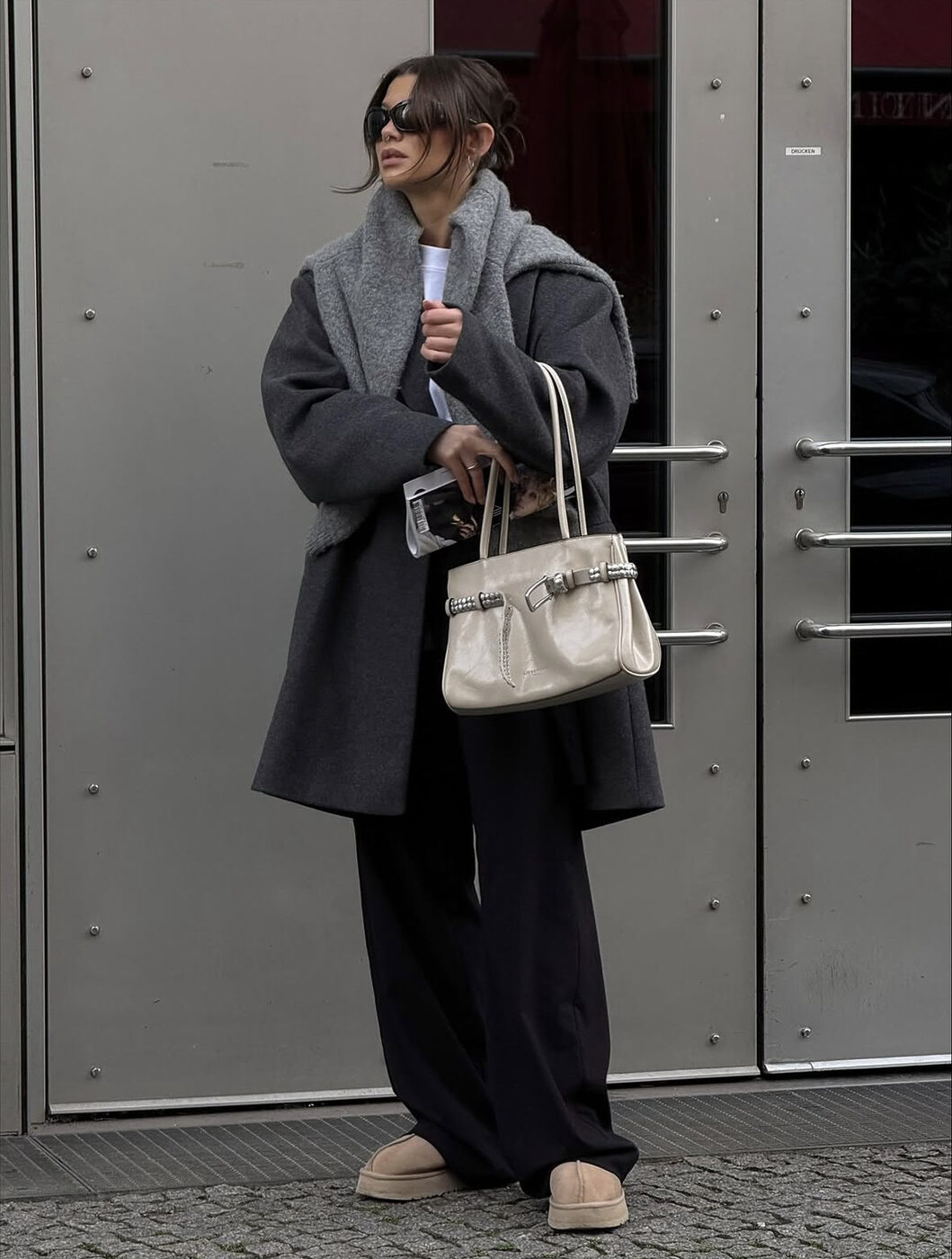 오히려 정장스러운 옷차림에 어그가 더 잘 어울릴 수 있어요. 퍼 코트와 블랙 슬랙스, 이너로는 셔츠로 출근룩에 어그로 마무리를 하는 겁니다. 포멀한 무드에 둥글한 쉐입의 신발로 의외의 재미를 즐겨보세요.