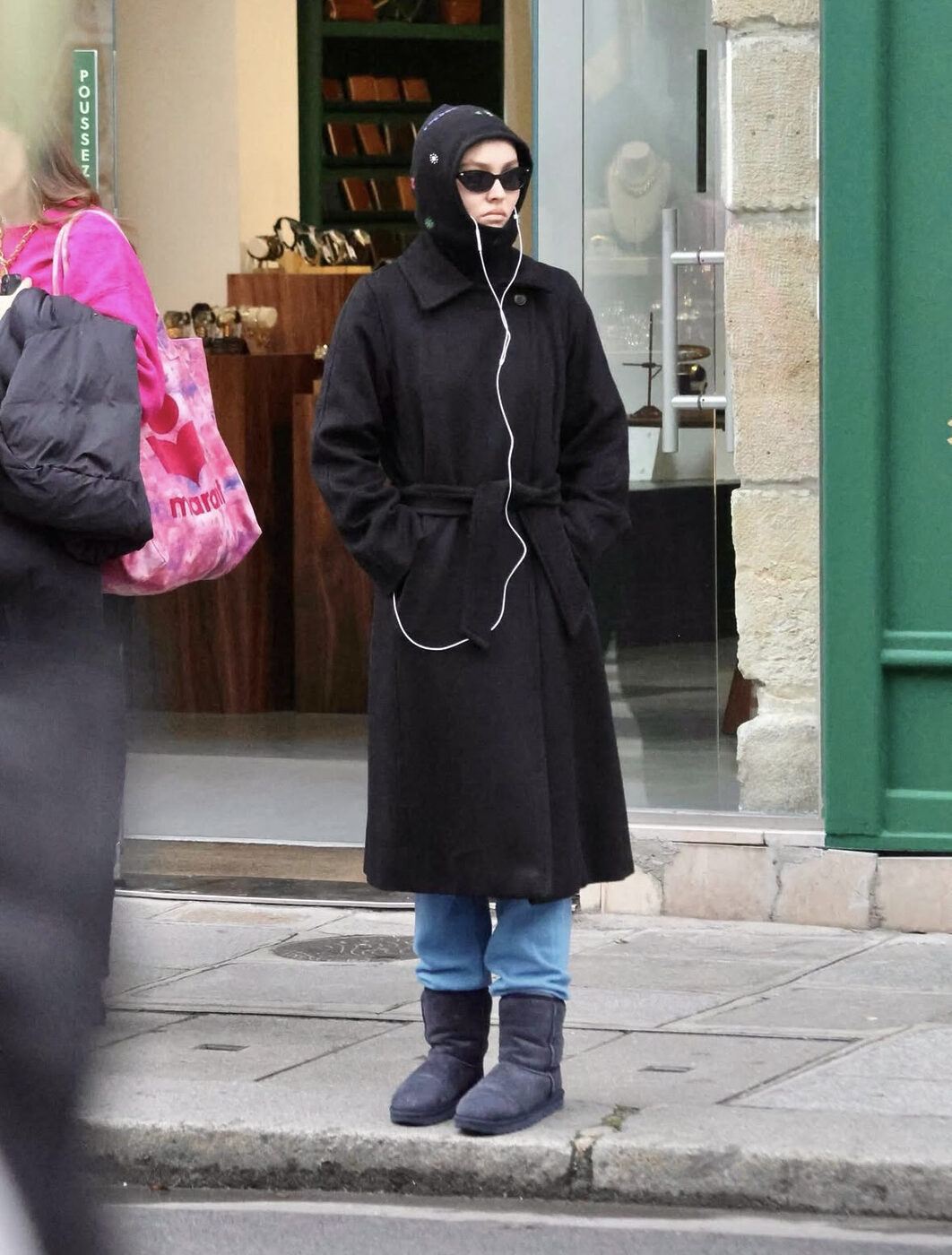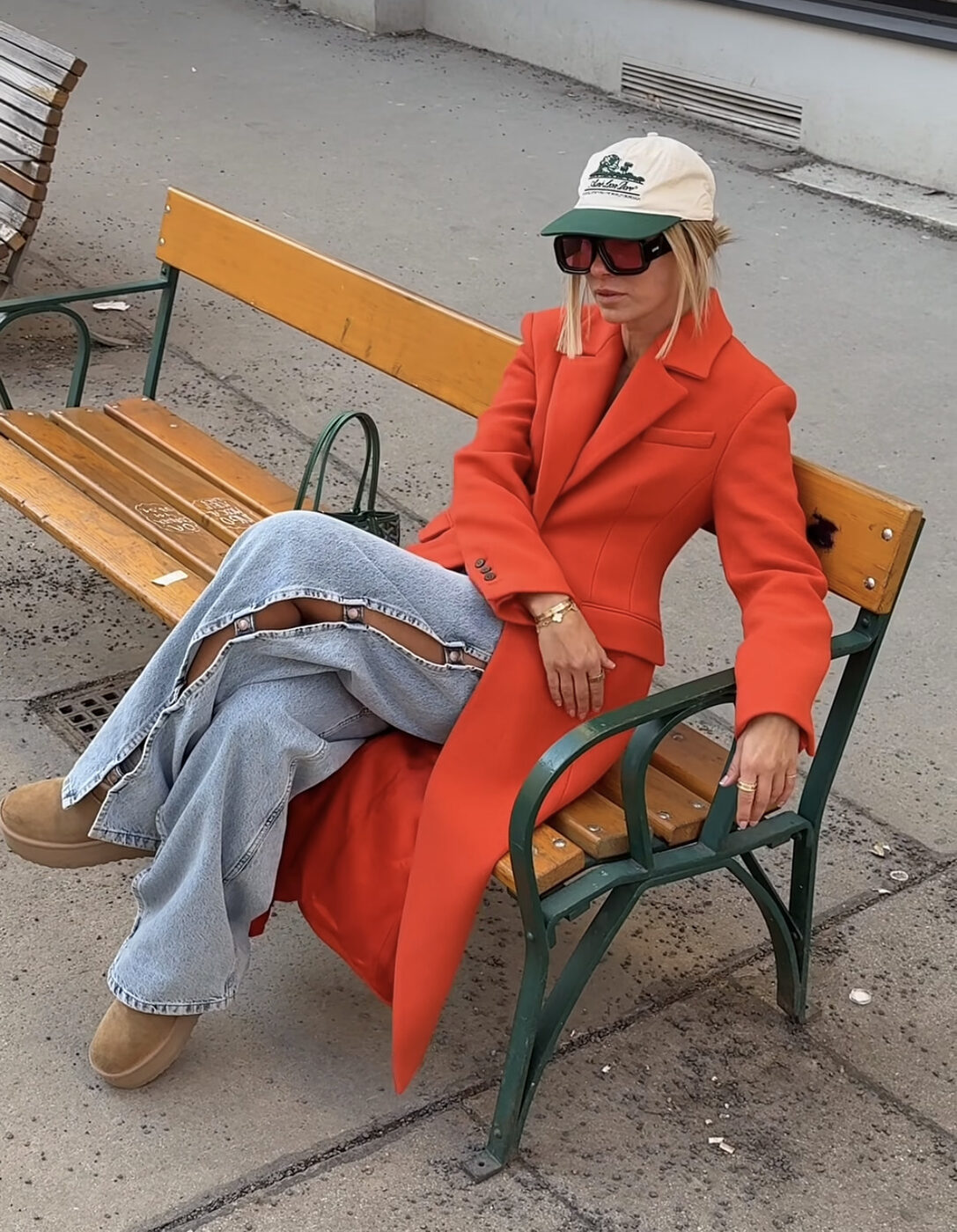 비비드한 레드오렌지 컬러의 롱 코트와 옆이 훤하게 뚫린 청바지, 무심하게 쓴 모자와 어그가 쿨한 지수를 더 올려줍니다. 이렇게 한껏 차려 입은 옷에 하나의 위트로 어그를 가져가도 된다는 좋은 예시죠.