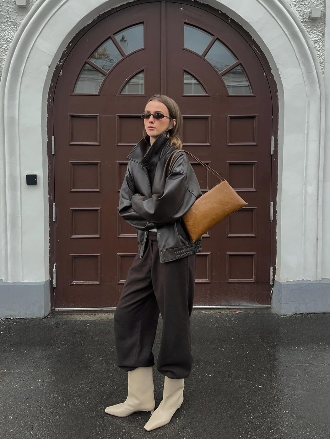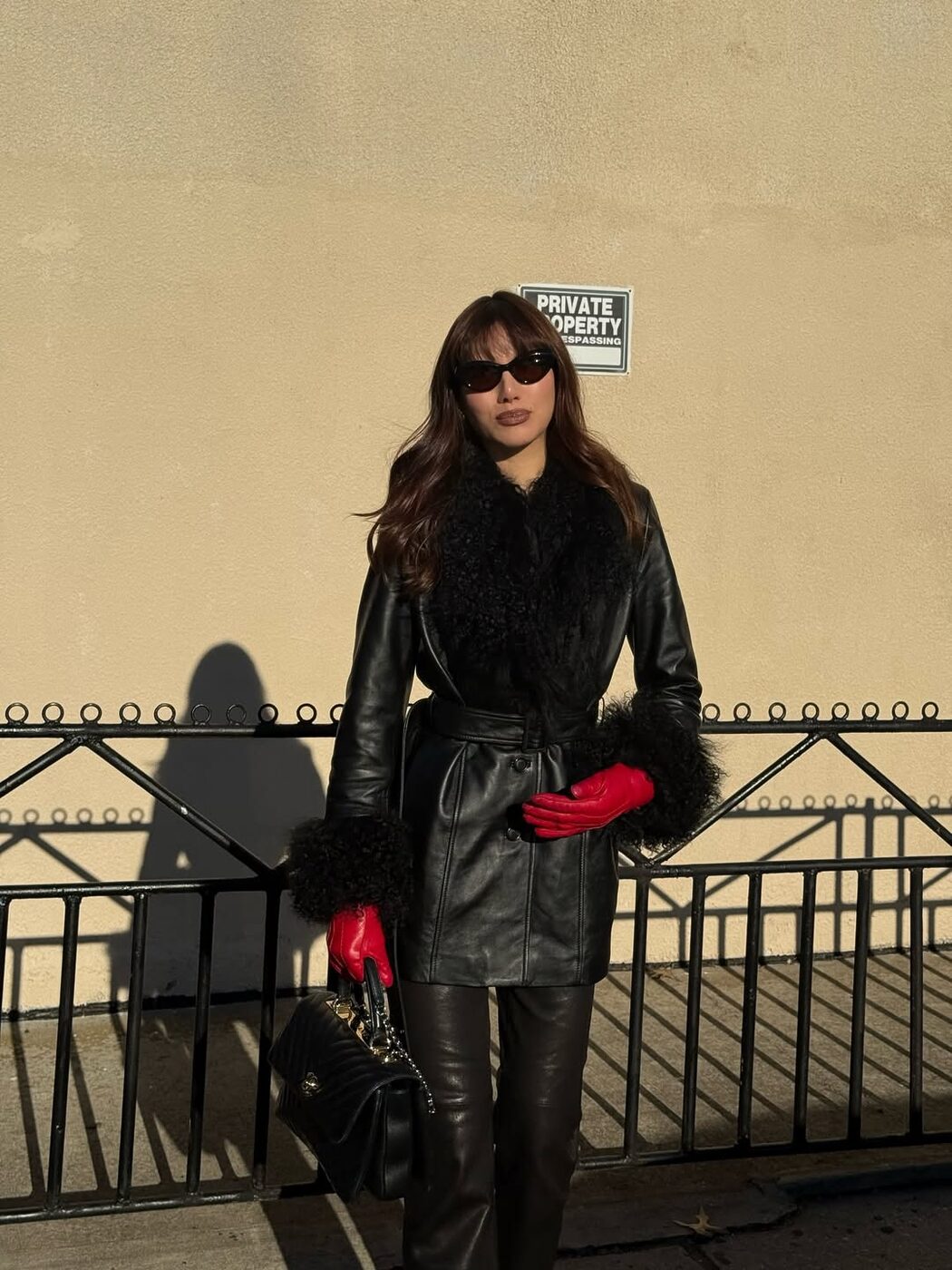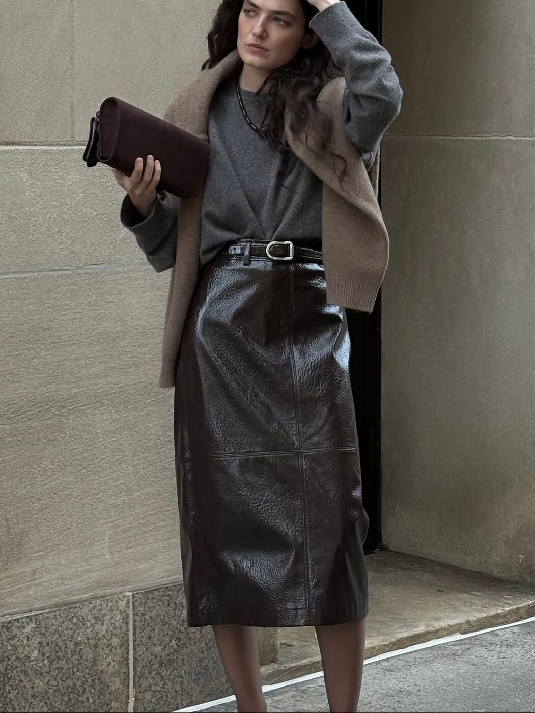 적당히 격식을 갖춘 듯 스타일리시해 보이기 위해서는 레더 아이템만 한 것이 없습니다. 레더 재킷은 어떤 룩에 걸쳐도 멋스러운 마무리가 되어주고, 레더 스커트나 팬츠 같은 하의는 니트에 매치하면 소재의 질감이 대비를 이뤄 세련된 분위기를 자아내죠. 단정한 셔츠와 함께 시크한 오피스 룩이자 연말 파티 룩을 연출해 보는 것도 훌륭한 아이디어겠네요.