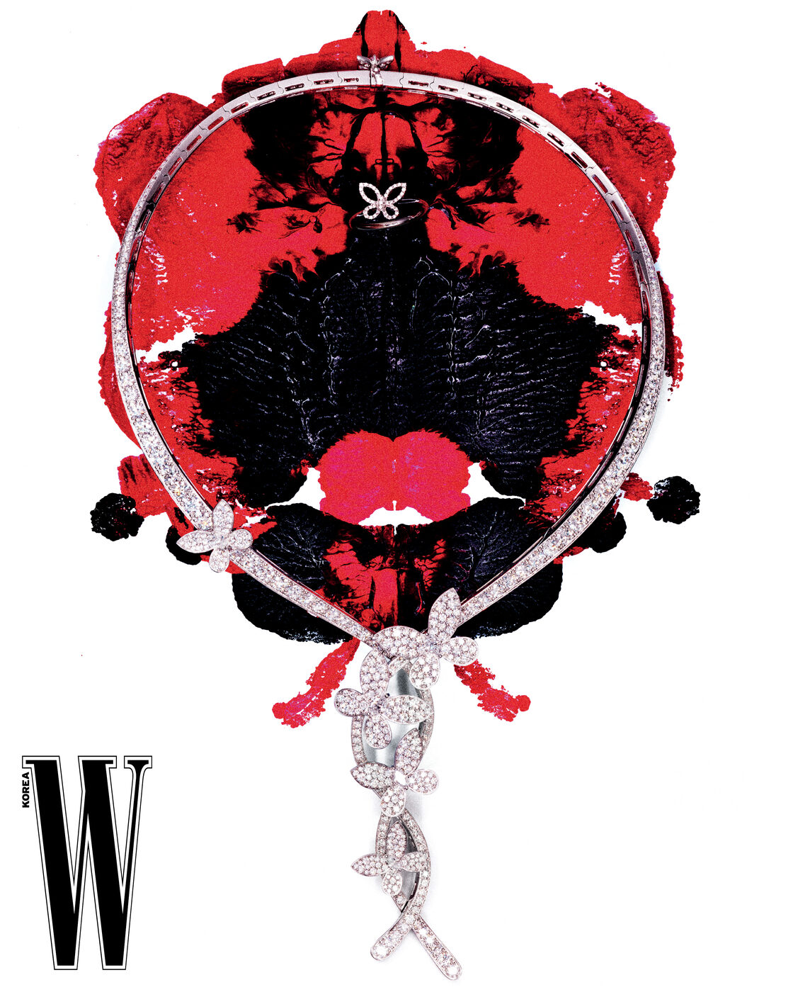 화이트 골드에 다이아몬드를 세팅한 파베 버터플라이 컬렉션 멀티 셰이프 다이아몬드 네크리스, 화이트 골드에 다이아몬드를 세팅한 버터플라이 실루엣 컬렉션 파베 다이아몬드 미니 링은 Graff 제품.