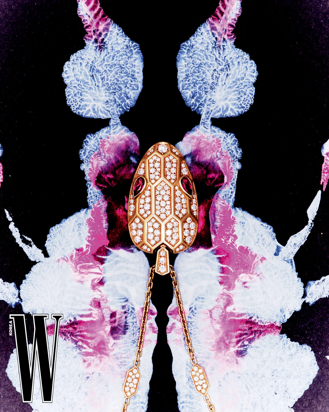 로즈 골드에 루벨라이트와 다이아몬드를 세팅한 세르펜티 네크리스는 Bvlgari 제품.