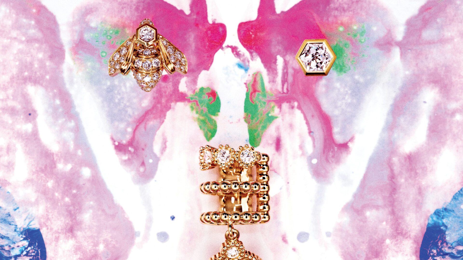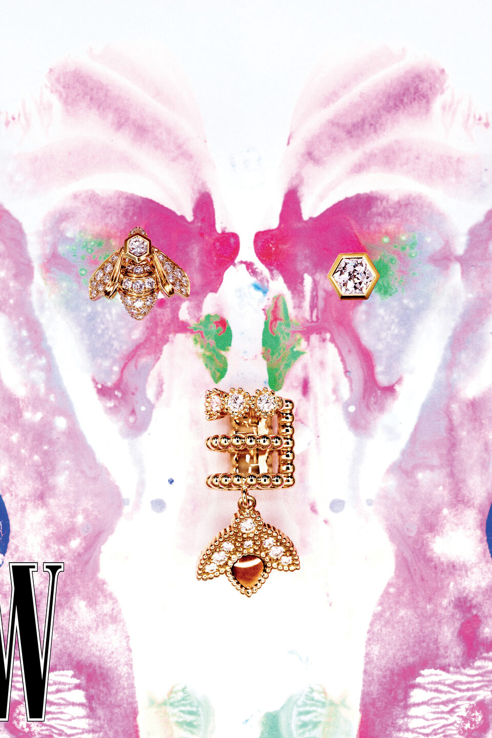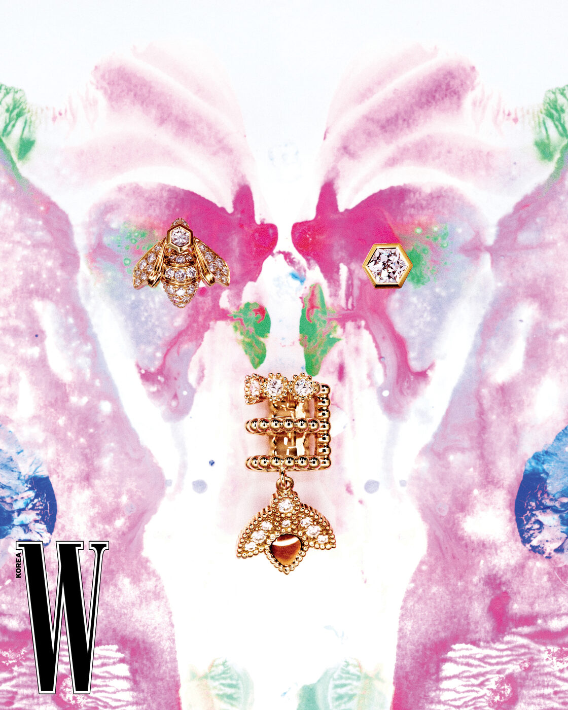 옐로 골드에 다이아몬드를 세팅한 비 드 쇼메 이어링은 Chaumet, 옐로 골드에 타이거즈 아이를 세팅한 로즈 드 방 이어링은 Dior Joaillerie 제품.