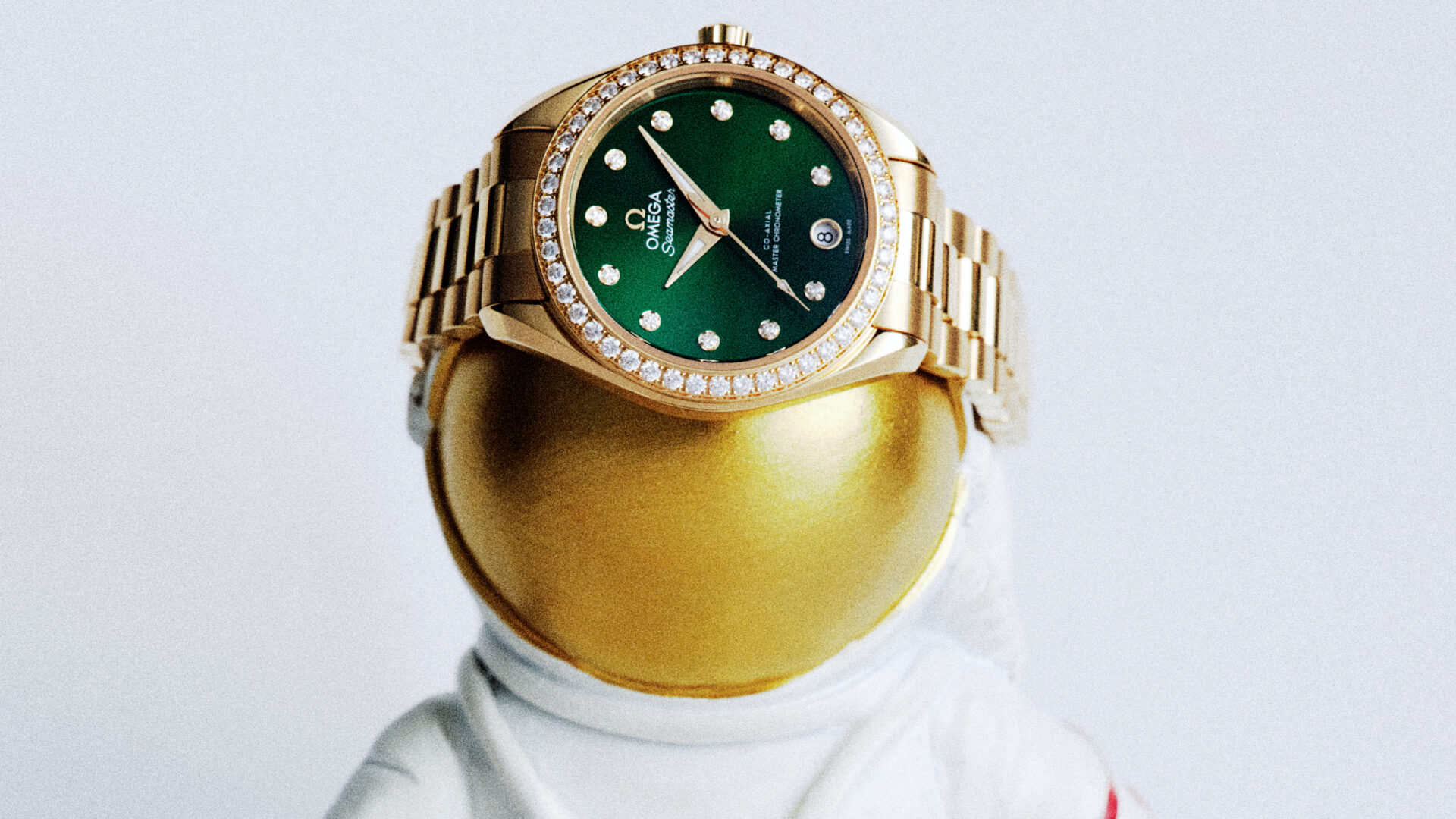 18K 문샤인TM 골드 케이스와 브레이슬릿, 그린 컬러 30mm 다이얼과 다이아몬드 세팅 베젤, 150m 방수 기능에 코-액시얼 이스케이프먼트 탑재와 마스터 크로노미터 인증을 받은 씨마스터 아쿠아 테라 컬렉션 워치는 Omega 제품.