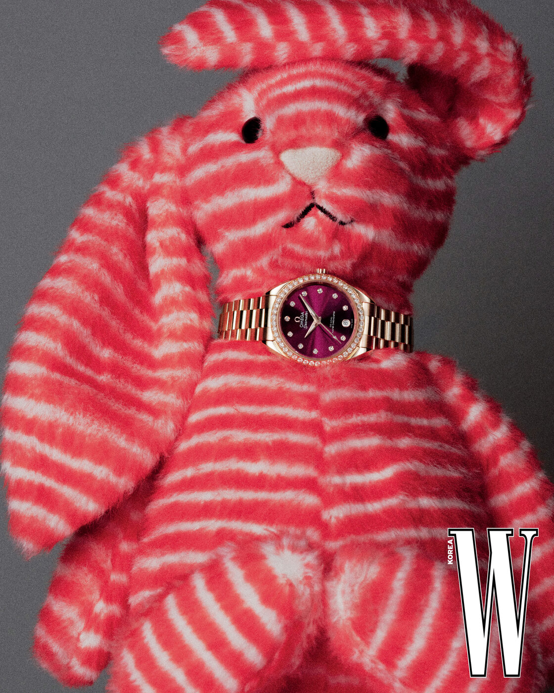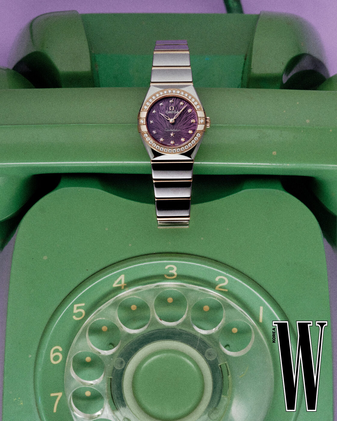 스테인리스 스틸과 18K 세드나TM 골드 케이스와 브레이슬릿, 퍼플 컬러 25mm 다이얼과 다이아몬드 세팅 베젤, 30m 방수 기능, 간편한 조정 장치를 적용한 시그니처 모노-랭 브레이슬릿 버전의 컨스텔레이션 컬렉션 워치는 Omega 제품.