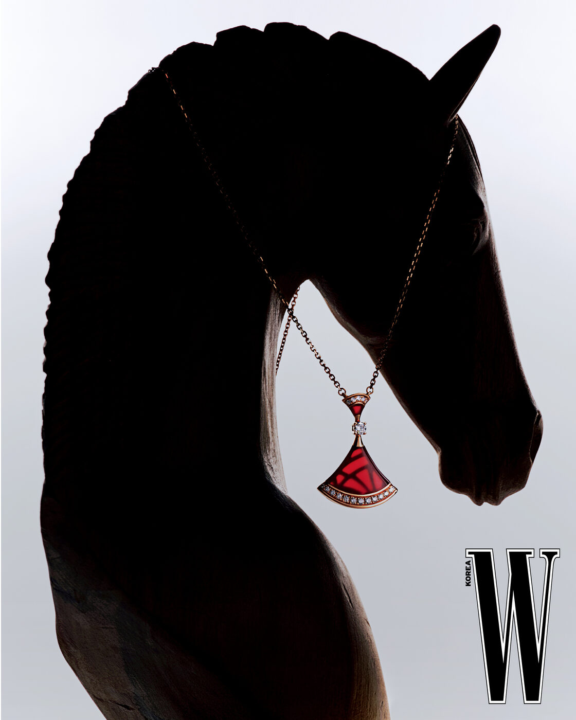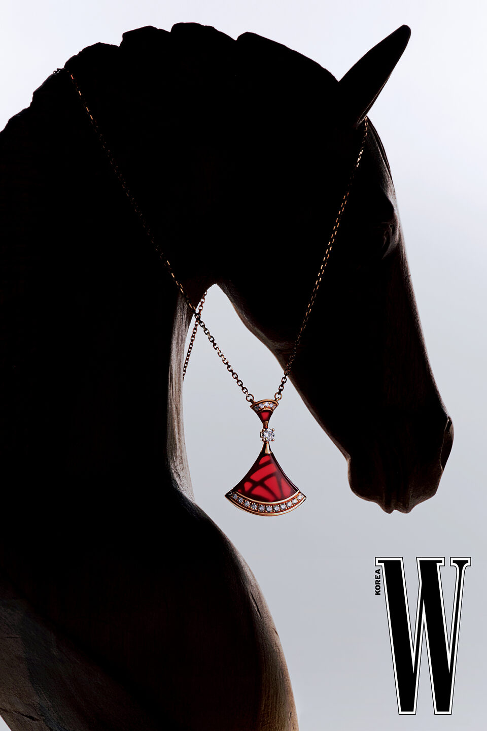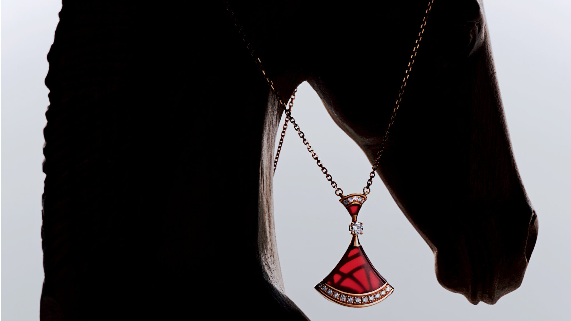 로즈 골드에 카닐리언과 다이아몬드를 세팅한 부채꼴 모티프의 디바스 드림 네크리스는 Bvlgari 제품.
