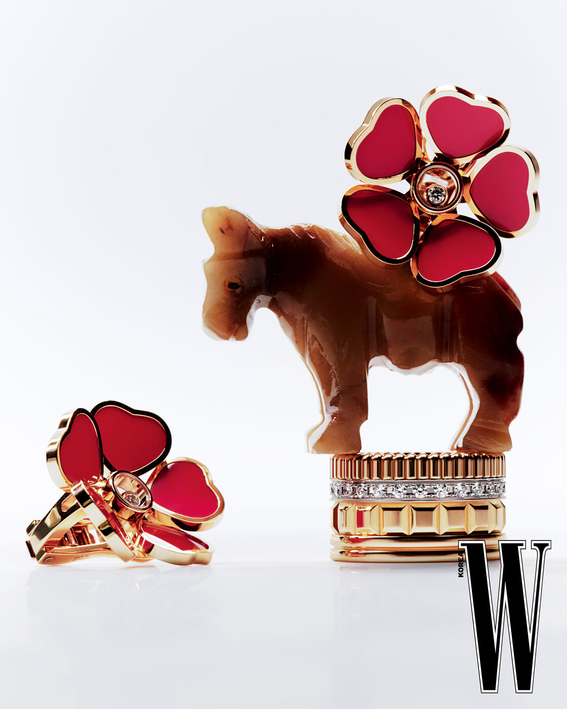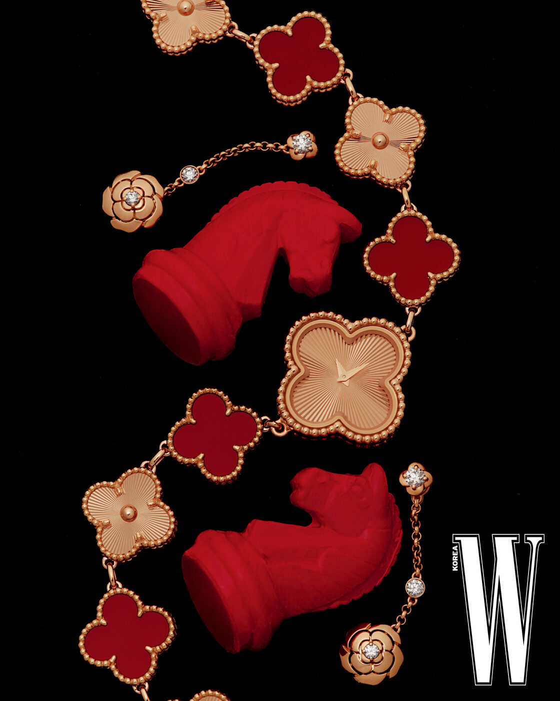 로즈 골드에 카닐리언 4개를 세팅한 스위트 알함브라 워치는 Van Cleef & Arpels, 로즈 골드에 다이아몬드를 세팅한 까멜리아 이어링은 Chanel Fine Jewelry 제품.