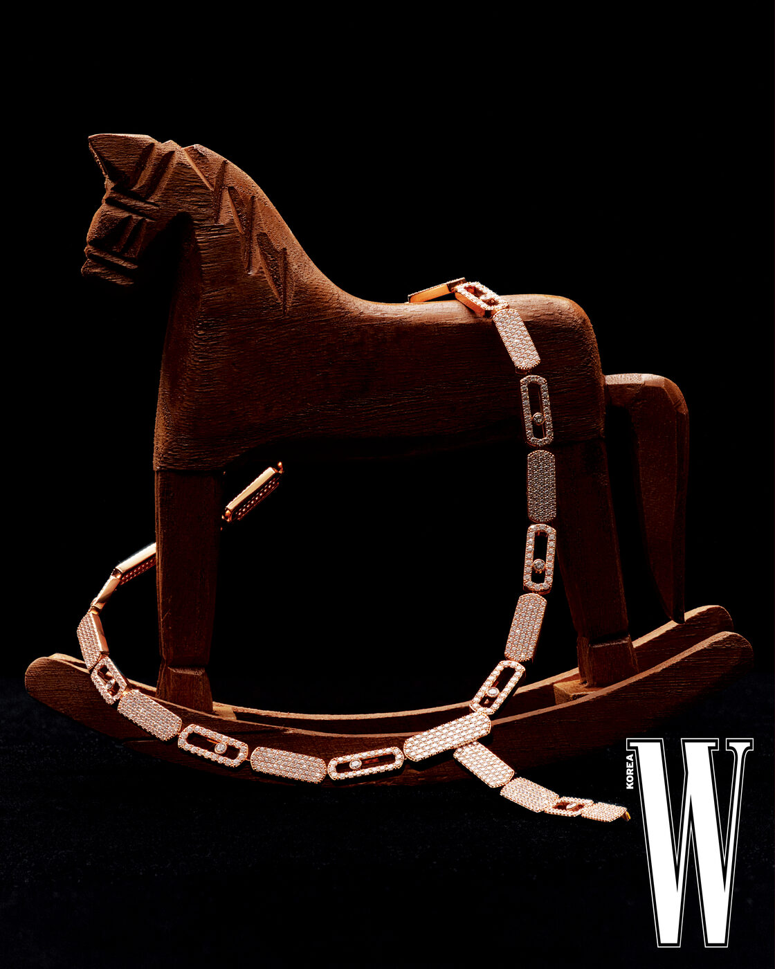 핑크 골드에 다이아몬드를 세팅한 임페리얼 무브 LM 파베 타이 네크리스는 Messika 제품.