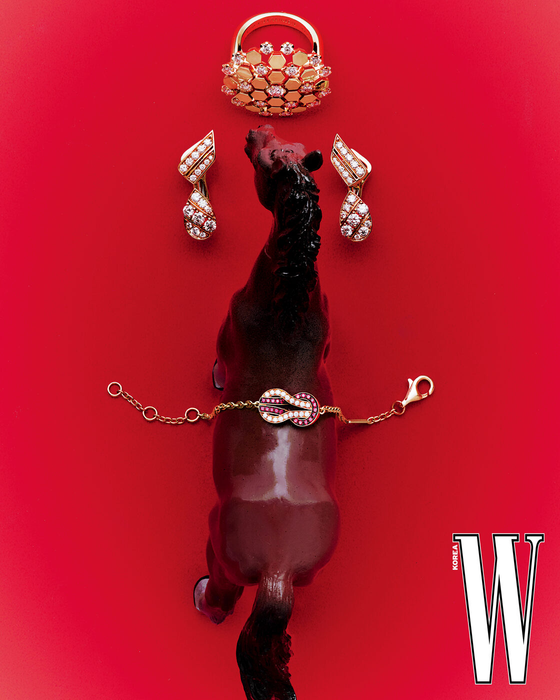 로즈 골드에 2개의 댄싱 다이아몬드, 레드 스톤을 세팅한 쇼파드 해피 하트 이어클립은 Chopard, 핑크 골드와 화이트 골드에 다이아몬드를 세팅한 콰트로 레디언트 다이아몬드 라지 링은 Boucheron 제품.