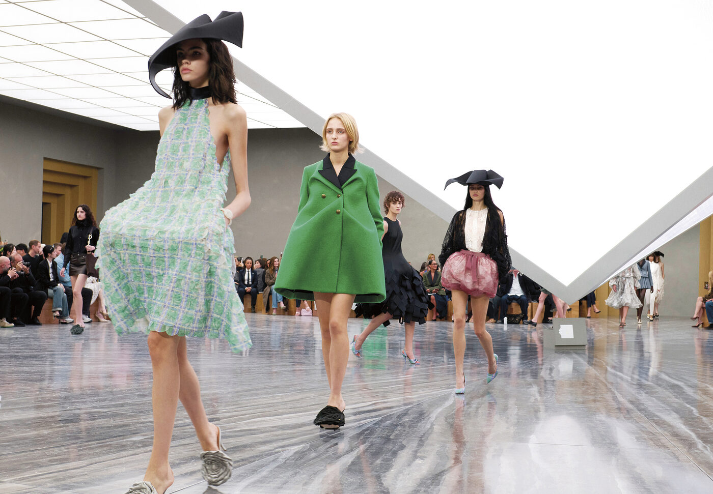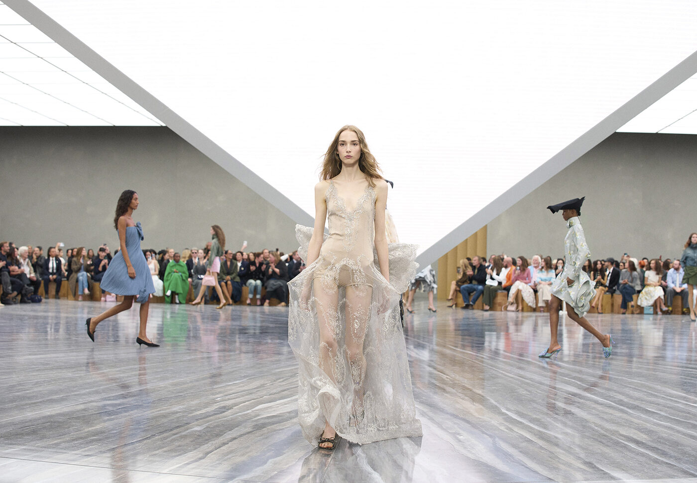 무대 연출 역시 이러한 태도를 반영한다. 루카 구아다니노와 스테파노 바이시가 설계한 공간은 과장 없이 절제된 분위기를 유지했고, 다큐멘터리 감독 애덤 커티스가 제작한 영상은 뒤집힌 LED 피라미드 위에 투사되어 디올의 과거를 시간의 흐름 속에서 다시 바라보게 했다. 영상은 곧 디올 구두 상자 안으로 사라지며, 하우스의 기억이 보관되고 다시 꺼내질 수 있음을 상징적으로 드러냈다.