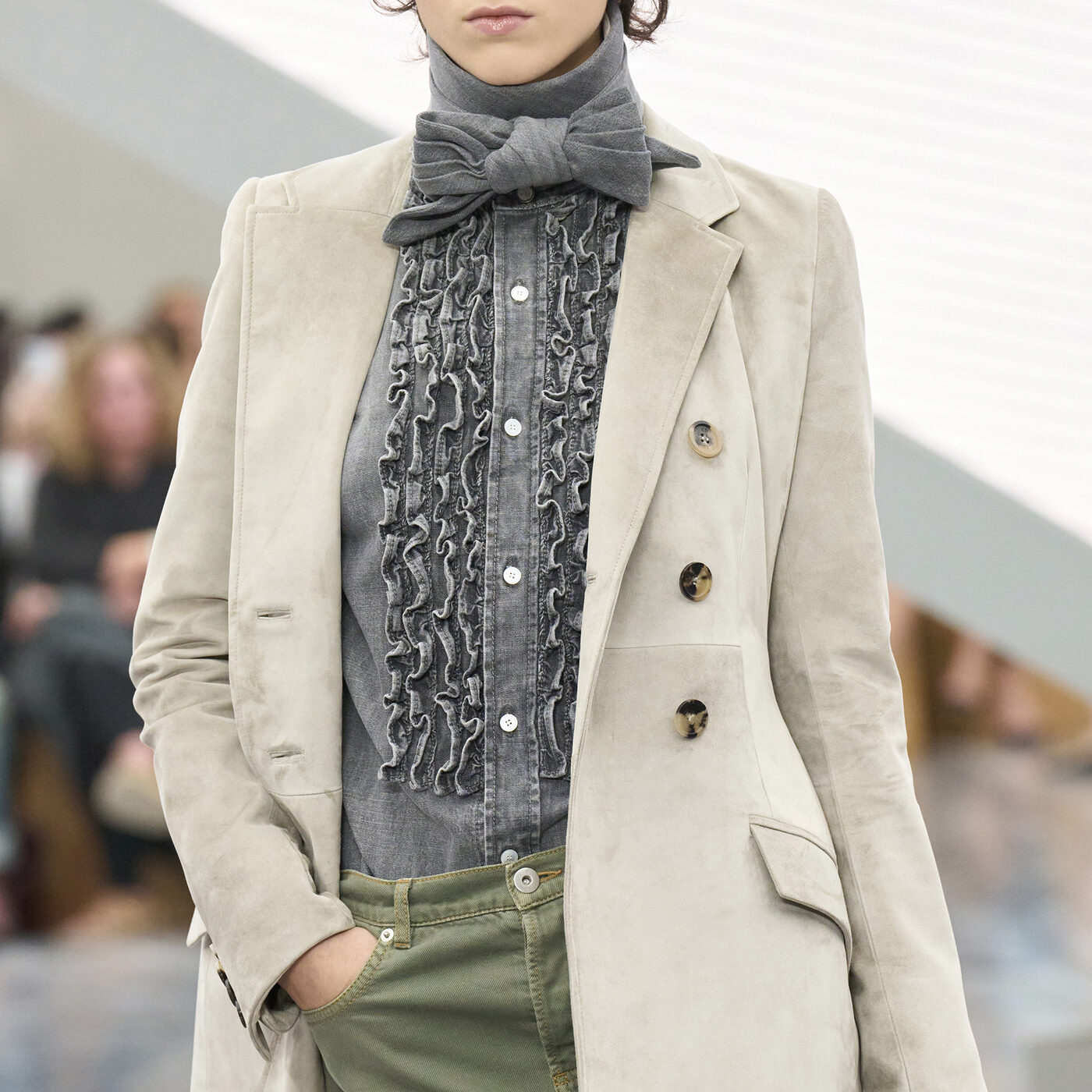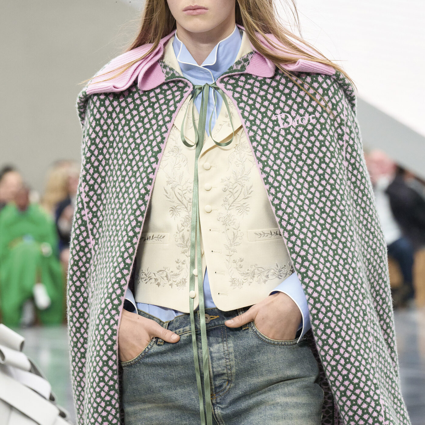 이번 컬렉션에서 가장 분명하게 드러난 요소는 보우, 즉 리본 장식이다. 핀치 프런트 코트와 드레이프가 살아 있는 미니 스커트, 가볍게 흩날리는 레이스 드레스, 디올 시갈 탑핸들백에 이르기까지 보우는 다양한 모습으로 등장한다. 작아진 바 재킷에는 조각적인 볼륨이 더해졌고, 케이프와 풍성한 쇼츠는 디올이 지닌 오트 쿠튀르의 전통을 자연스럽게 떠올리게 한다. 전통적인 요소들은 강조되기보다 컬렉션 안에서 제자리를 찾는다. 그렇다면 이번 컬렉션에서 가장 크게 달라진 점은 무엇일까? 변화는 형태보다 태도에서 먼저 읽힌다. 조나단 앤더슨은 디올의 유산을 특별한 순간에만 꺼내 입는 상징으로 두지 않는다. 대신 지금의 옷장 안으로 끌어와, 일상의 옷들과 자연스럽게 어우러지게 만든다. 예를 들어 보우 장식 상의는 데님 스커트와 함께 입어도 무리가 없고, 바 재킷 역시 셔츠나 니트 위에 가볍게 걸칠 수 있다. 디올의 상징은 앞에 나서지 않고, 익숙한 차림 속에 스며든다.