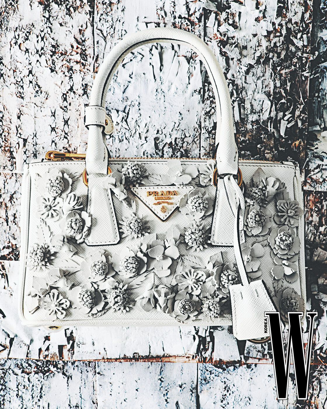 섬세한 아플리케 꽃 장식이 달린 핸드백은 프라다 제품.